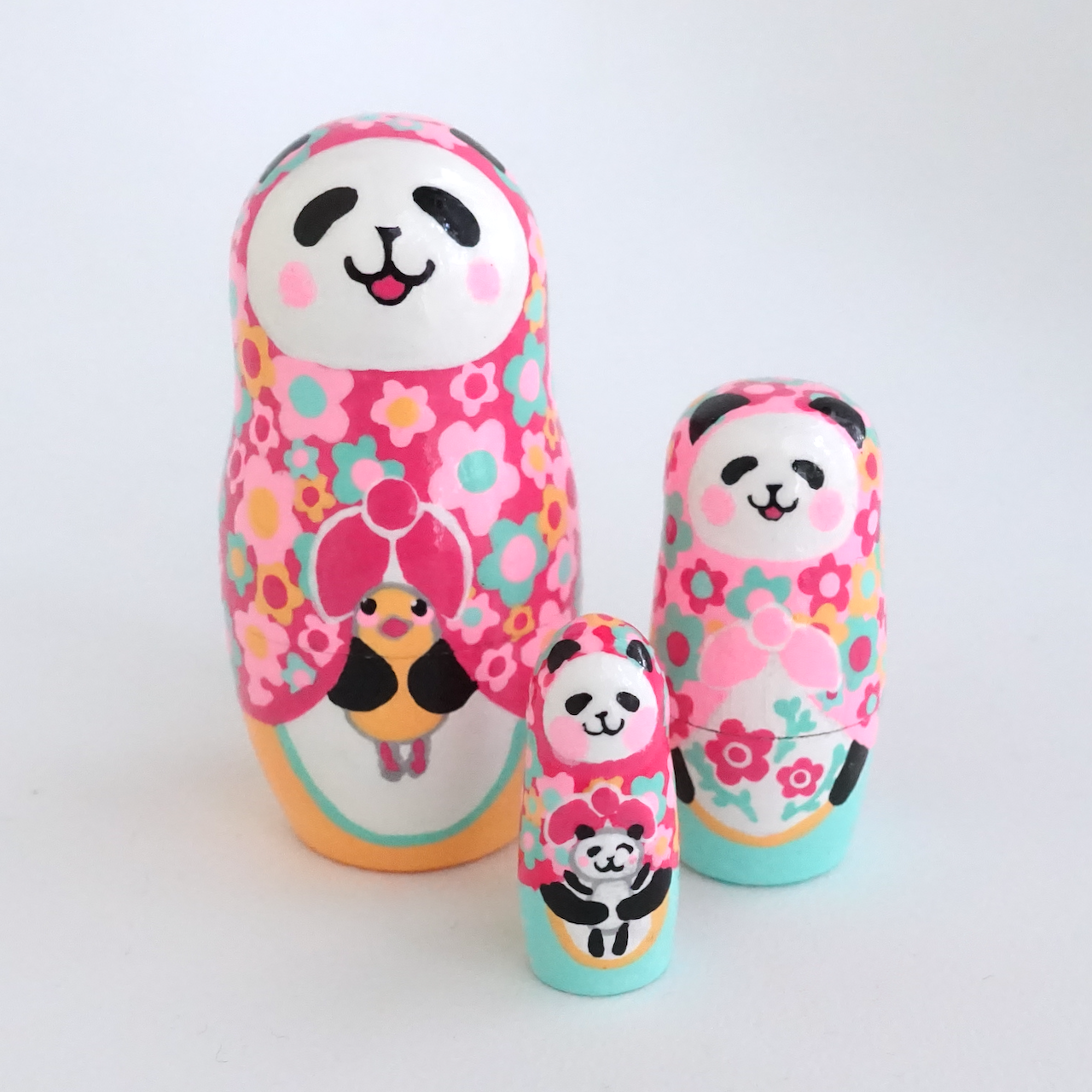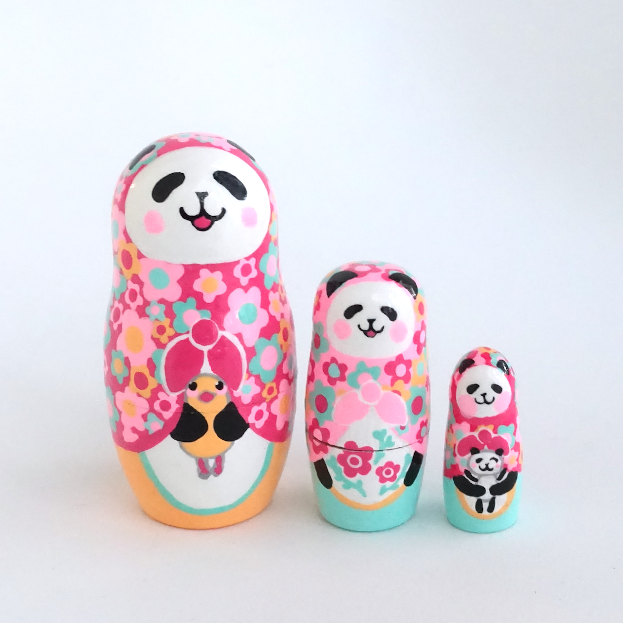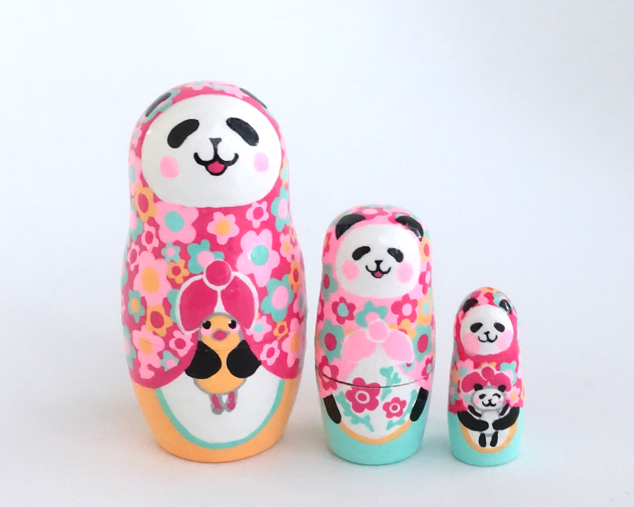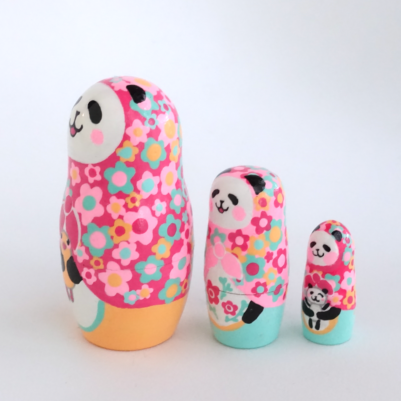 カラフルな花柄をまとった、3人組のパンダ・マトリョーシカです。