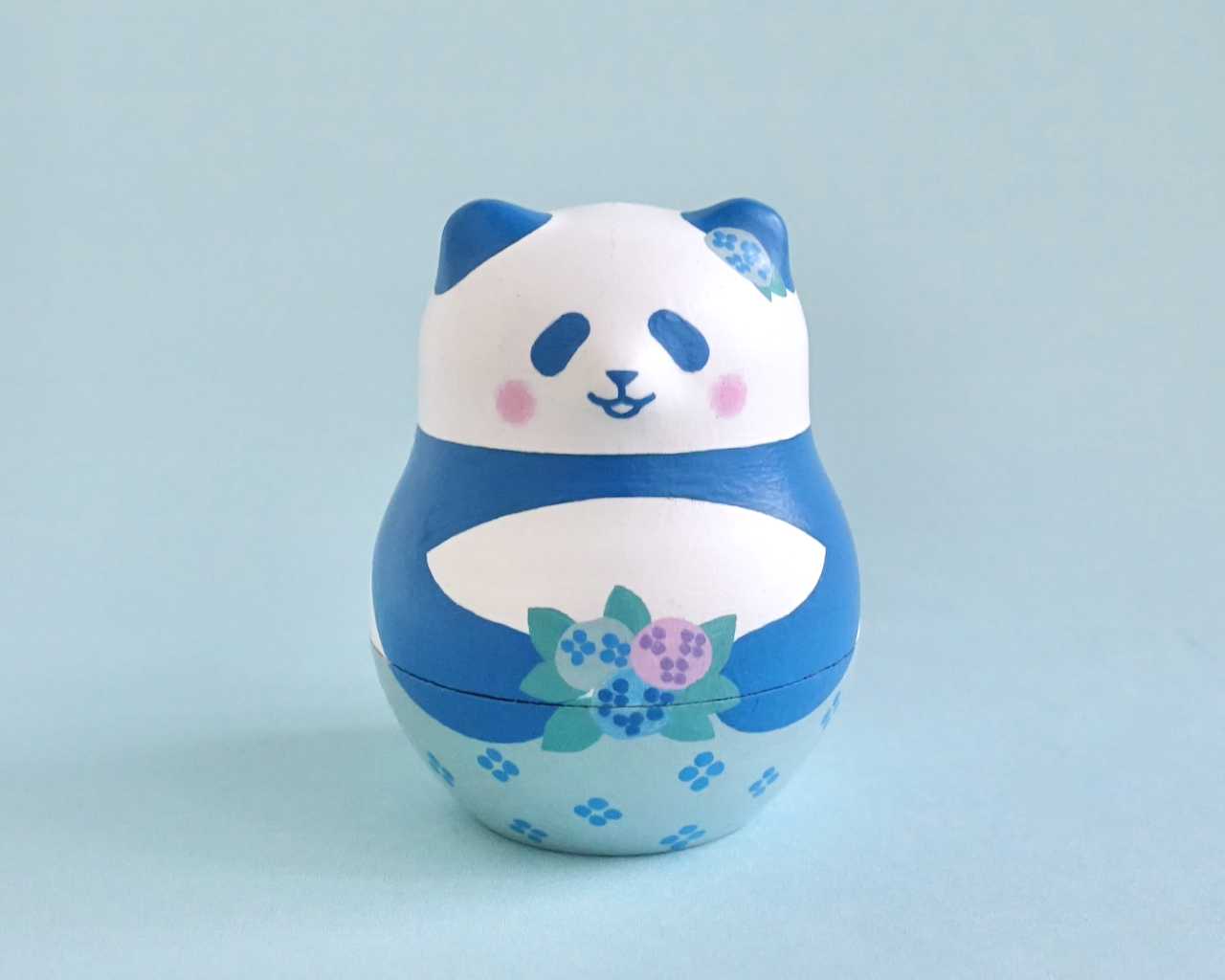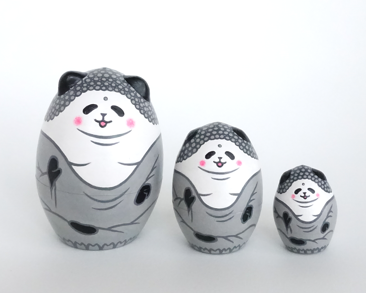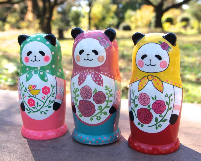 ロシアの職人さん作の木地に、アクリル絵の具で絵付けしました。パンダが多めです。猫や小鳥、ペンギンもいます。次から次へと出てくるマトリョーシカ人形の楽しさを味わっていただけたらうれしいです。
