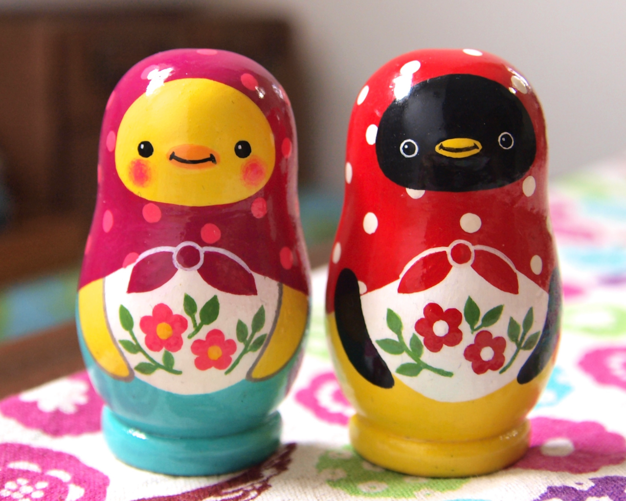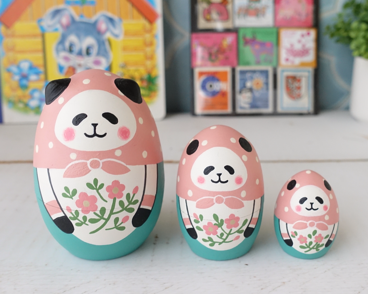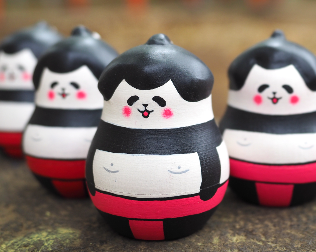 ロシアの職人さん作の木地に、アクリル絵の具で絵付けしました。パンダが多めです。猫や小鳥、ペンギンもいます。次から次へと出てくるマトリョーシカ人形の楽しさを味わっていただけたらうれしいです。