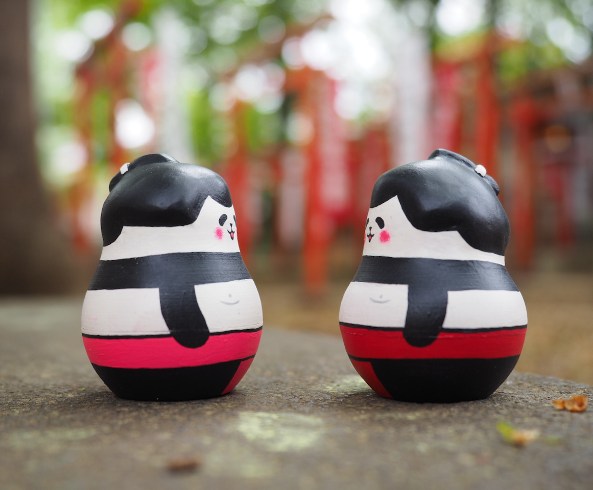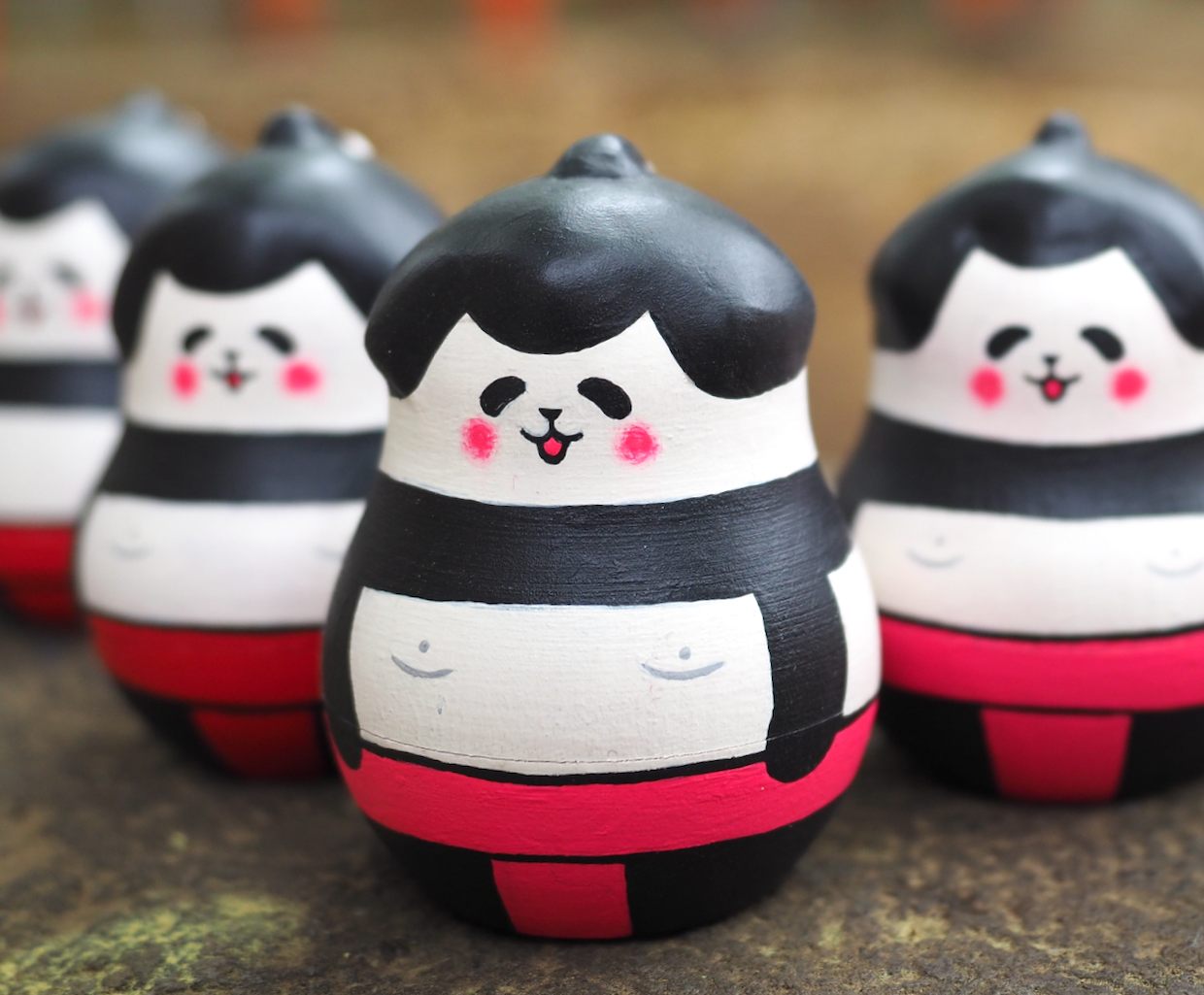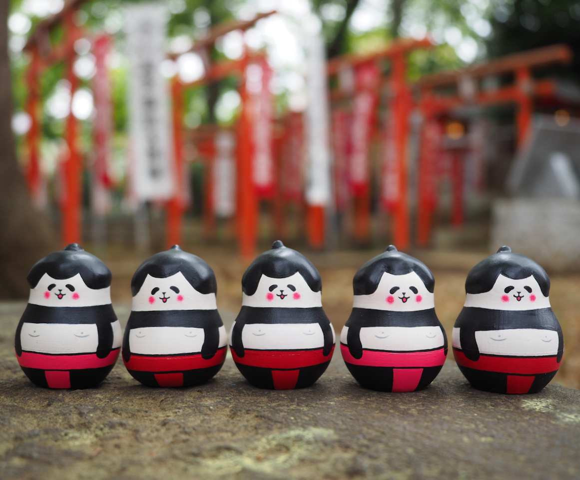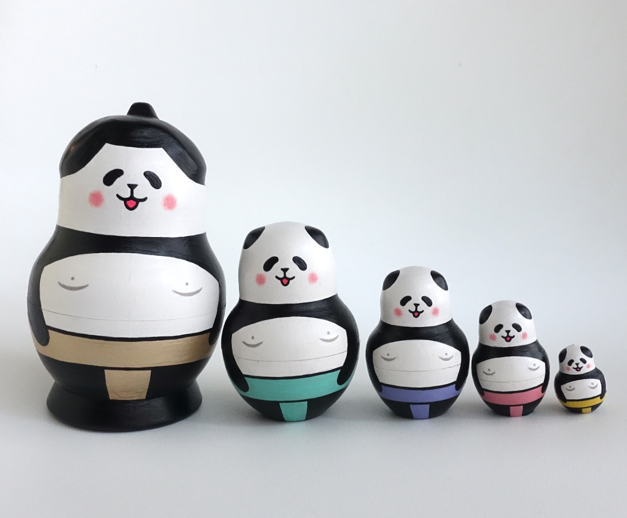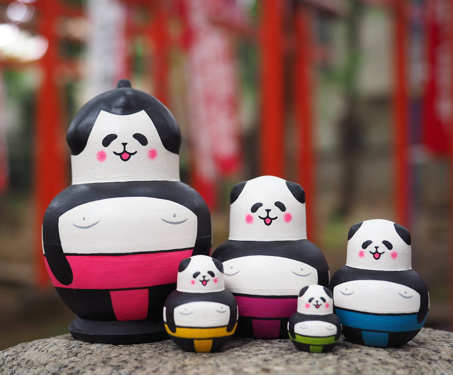 パンダ力士の5人組マトリョーシカです。大きい順に、横綱・大関・関脇・小結・前頭。がっしりした肩とぽっちゃり体型、色とりどりのふんどしがポイントです。