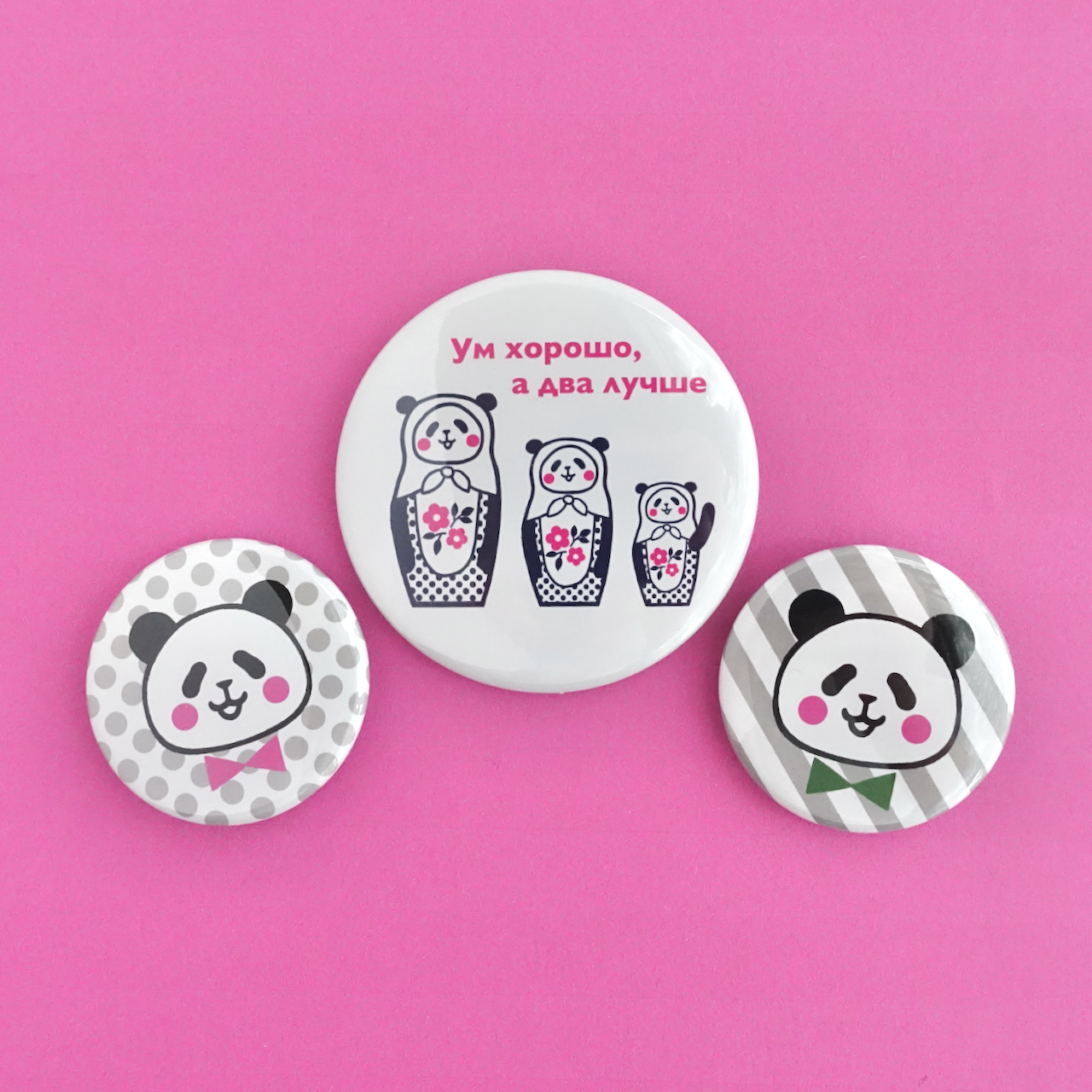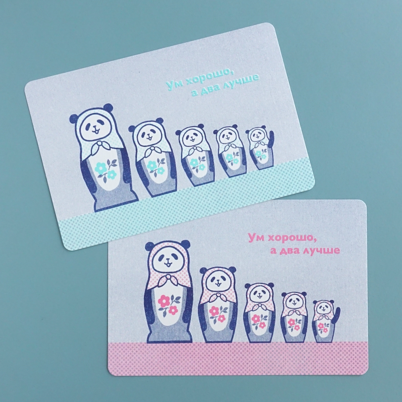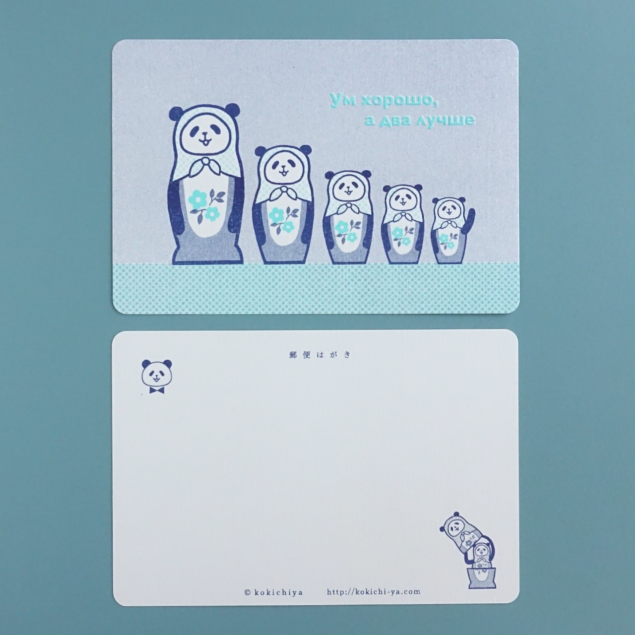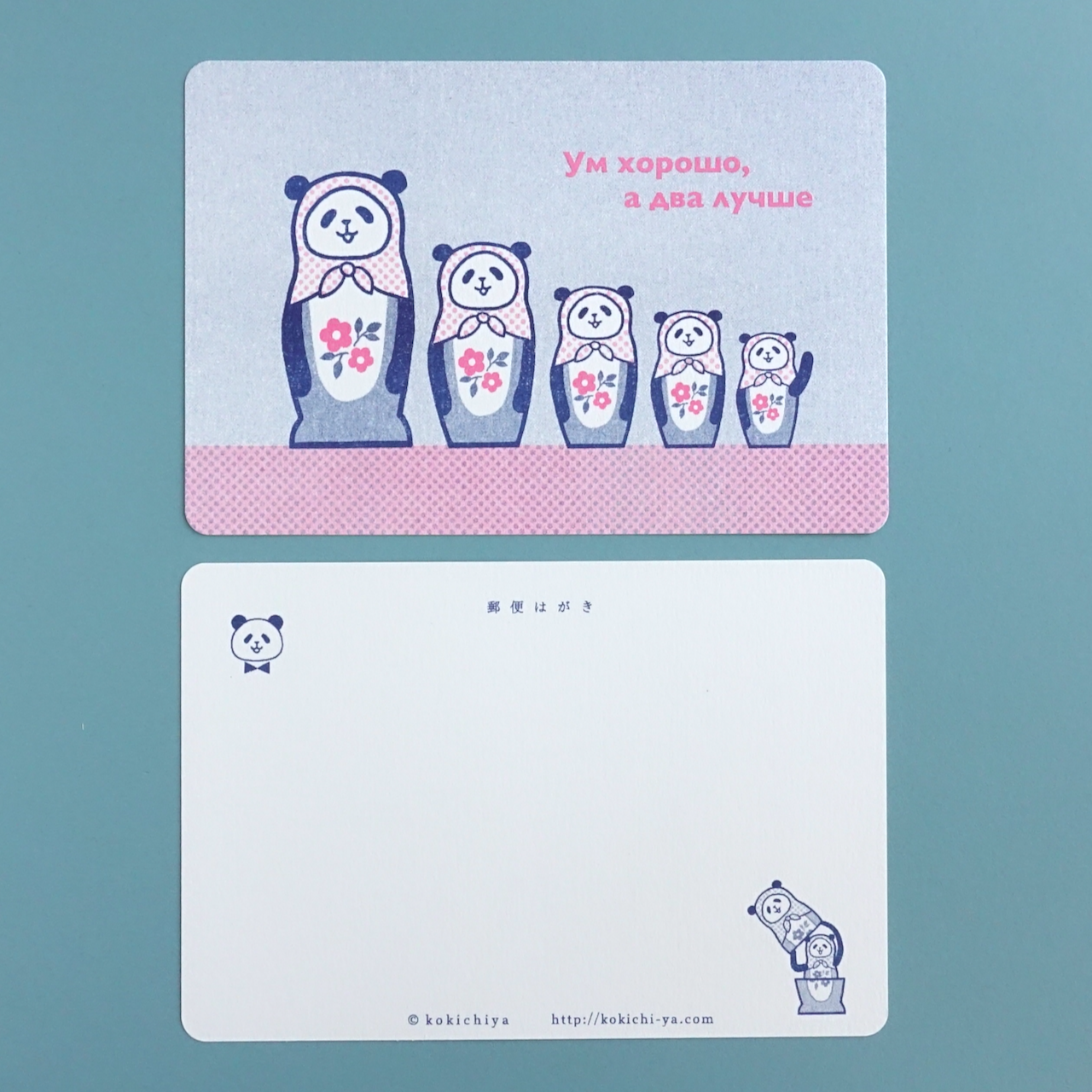片面には、5人組のパンダ・マトリョーシカ。ロシア語のことわざ『一人の知恵より、二人の知恵』を書きました。日本語の『3人寄れば文殊の知恵』に近い意味のことわざです。パンダが5人集まると、いいアイディアが湧いてきそうです。