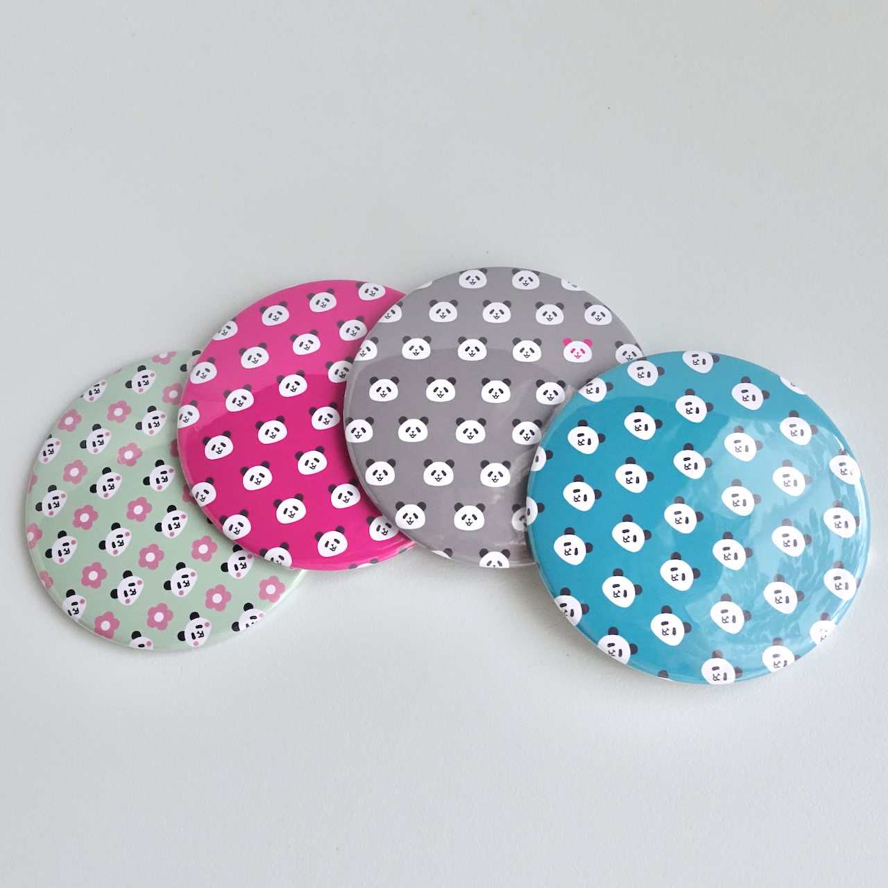 パンダ模様の缶ミラー。4つのカラーで作りました。