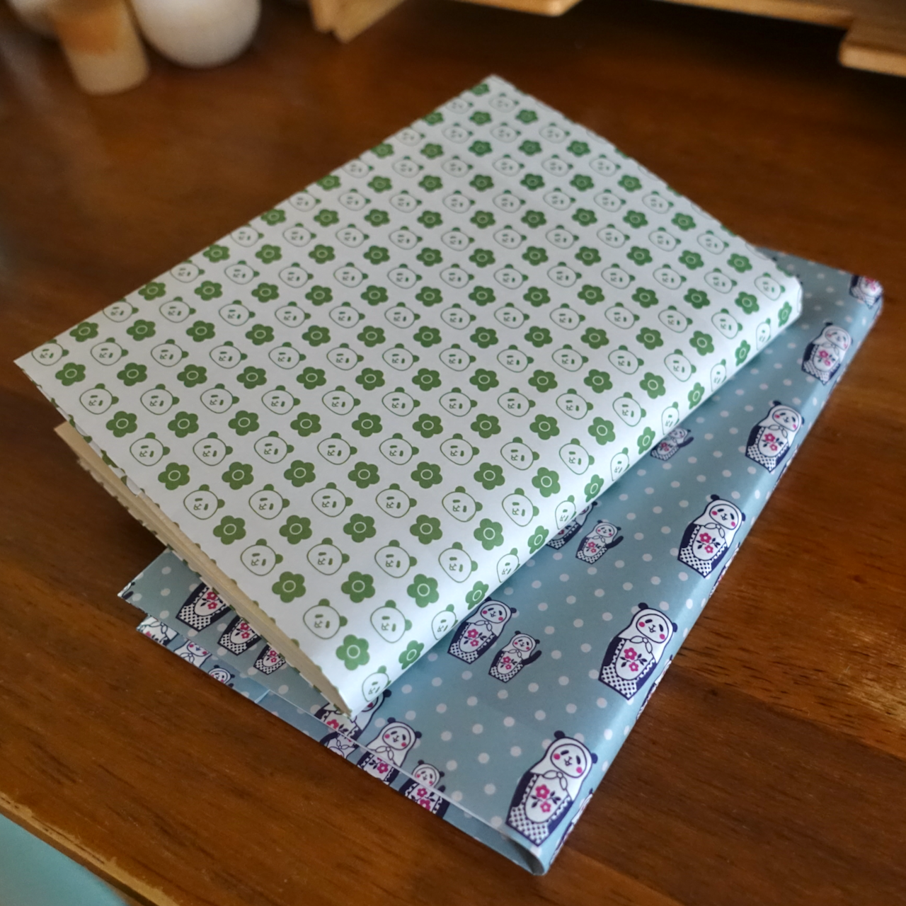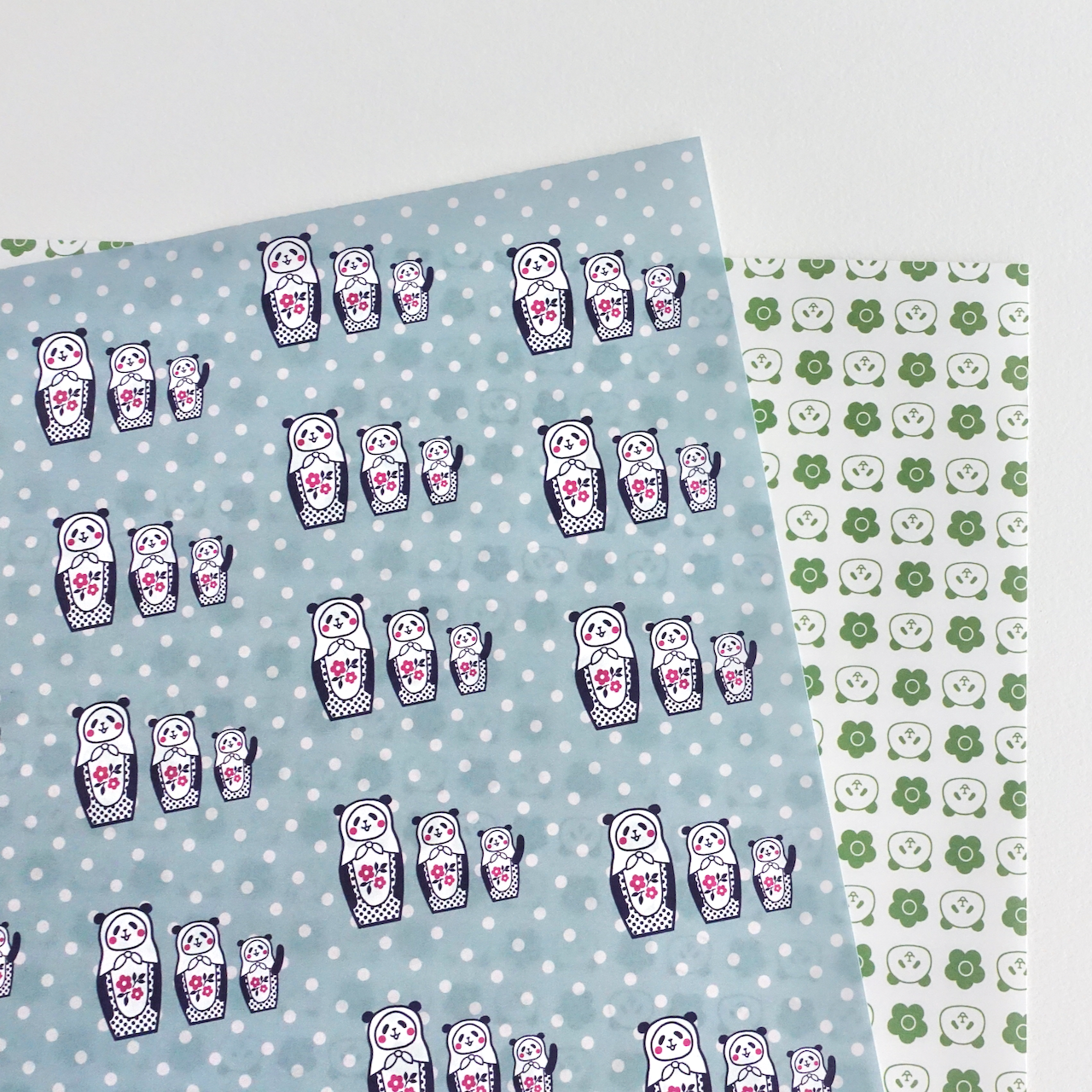 3人組マトリョーシカと、グリーンのパンダの2柄を作りました。紙は、デパートのギフト包装に使用される包装紙専用ペーパーを使っています。表面はツヤがあり、裏面はざらつきのある紙で、やや透け感があります。