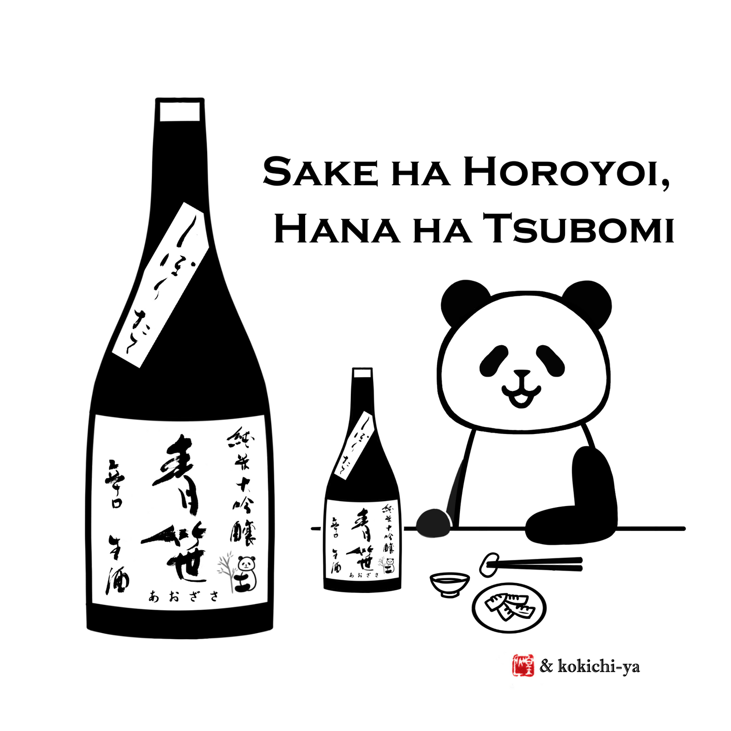 日本酒とパンダが好きな貴方へ、オリジナルの日本酒「青笹」をお届けします。ラベルの字は、書家 煌月(こうげつ)さんに書いていただきました。