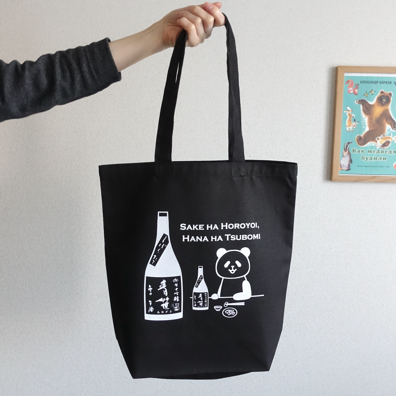 綿100%のトートバッグです。タケノコをつまみに、パンダと盃を交わしましょう。〜酒はほろ酔い、花は蕾〜