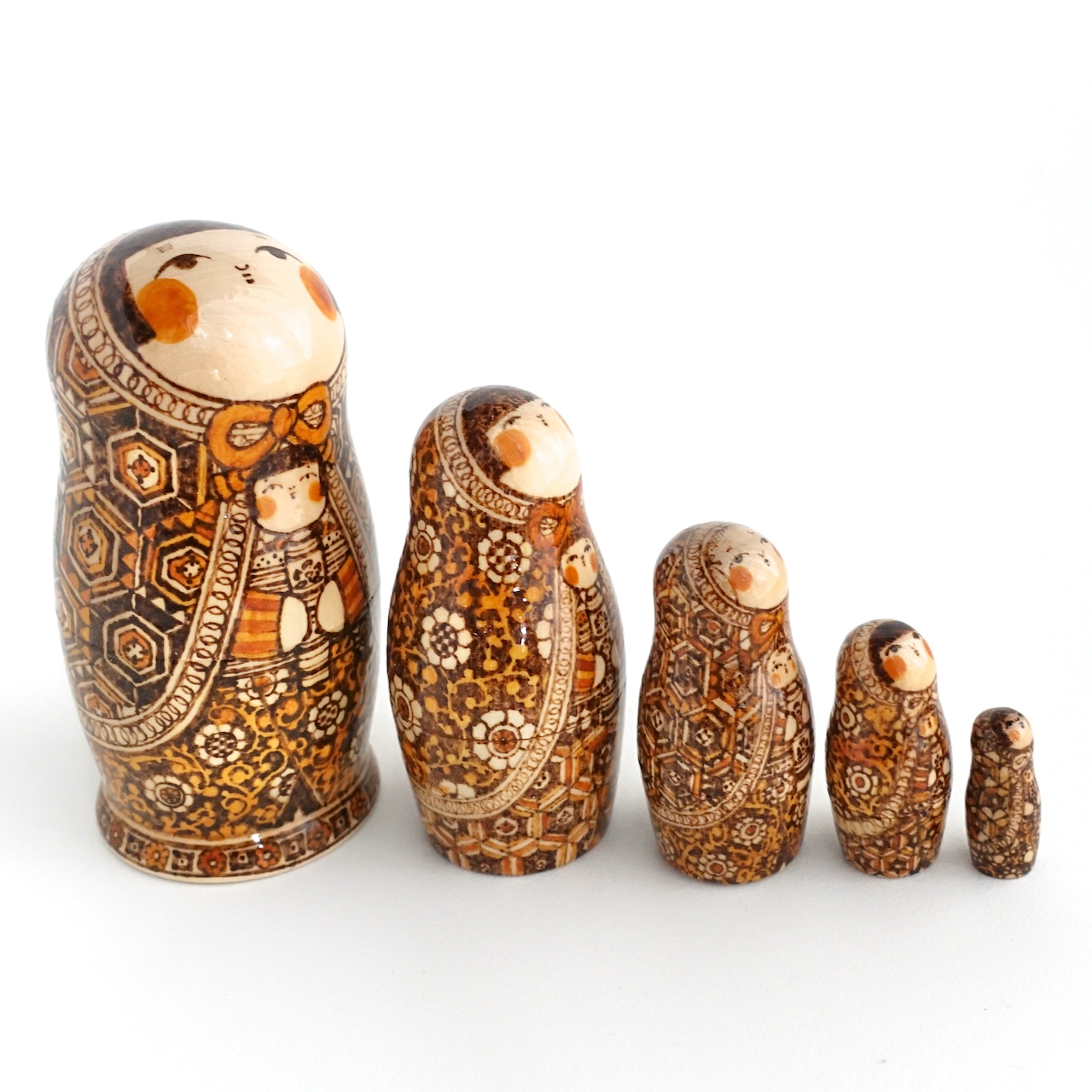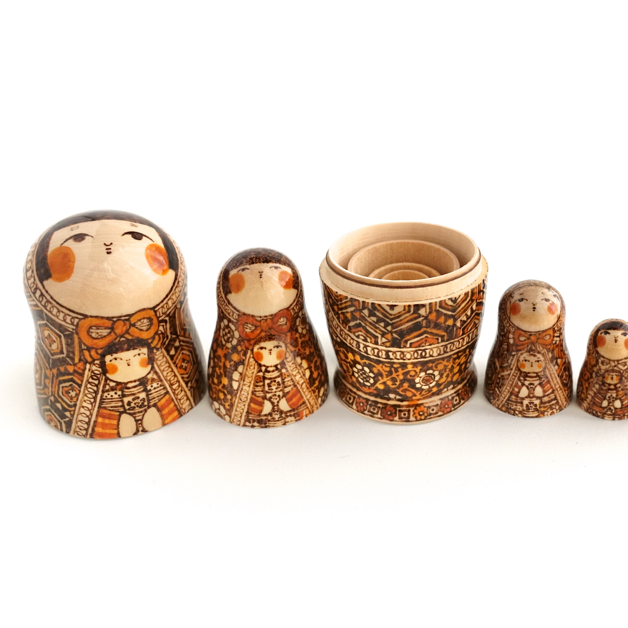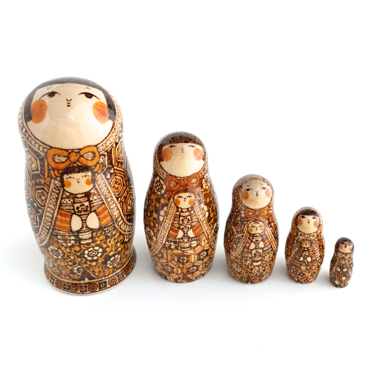 伝統文様の衣装をまとった、こけし顔の5人組マトリョーシカです。