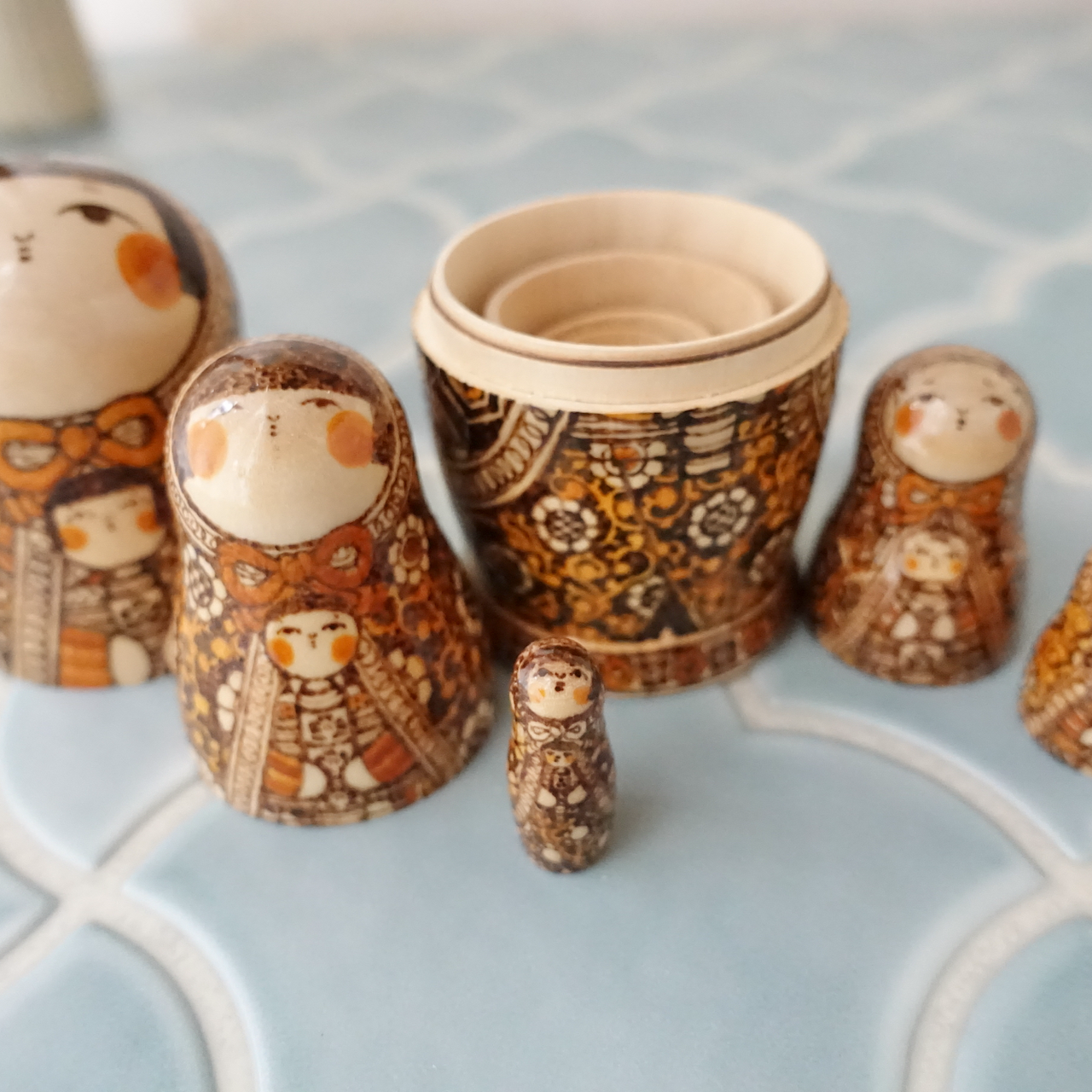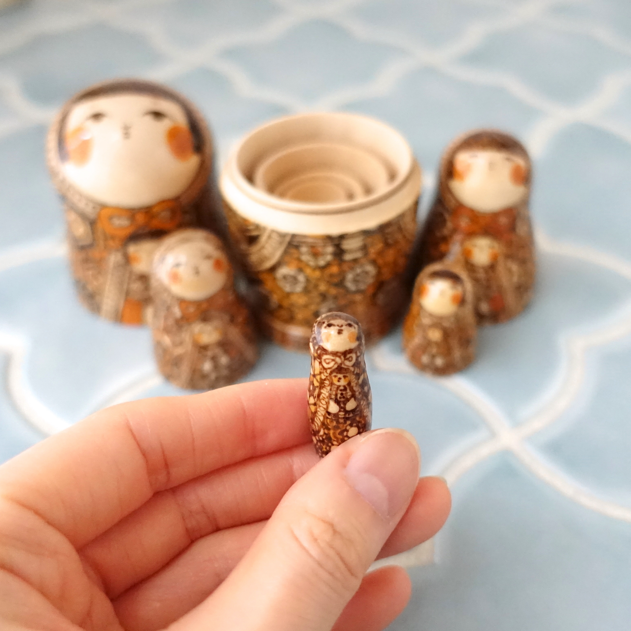こきちや姉妹の妹さるこが、ロシア製の白木マトリョーシカに絵付けしました。