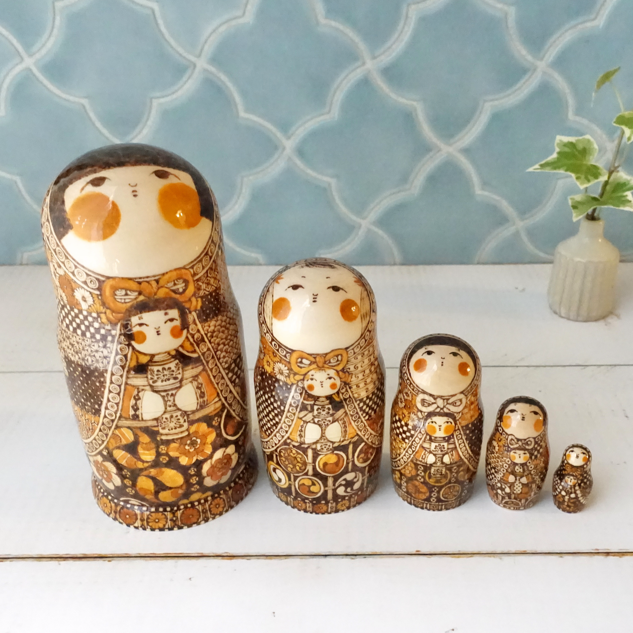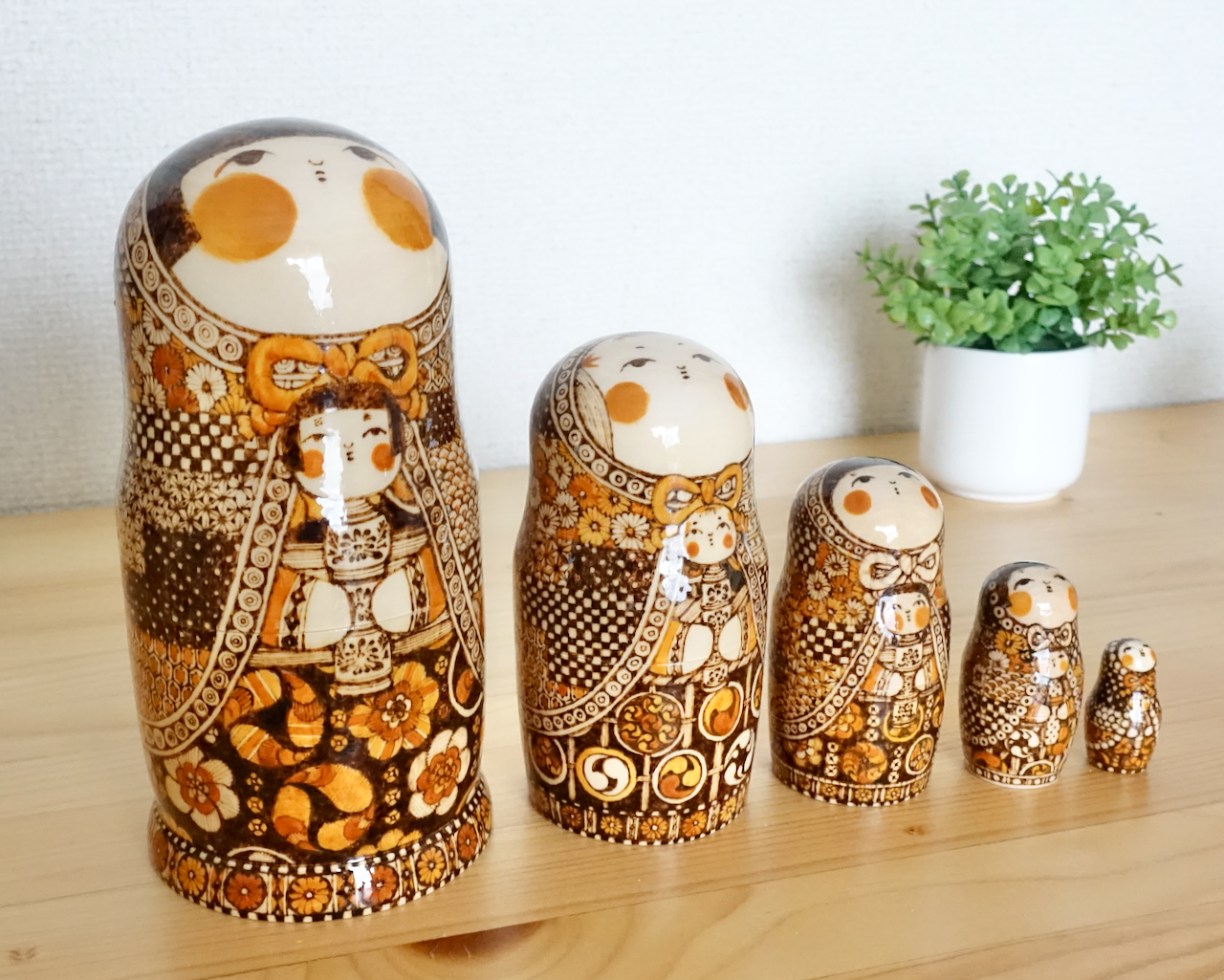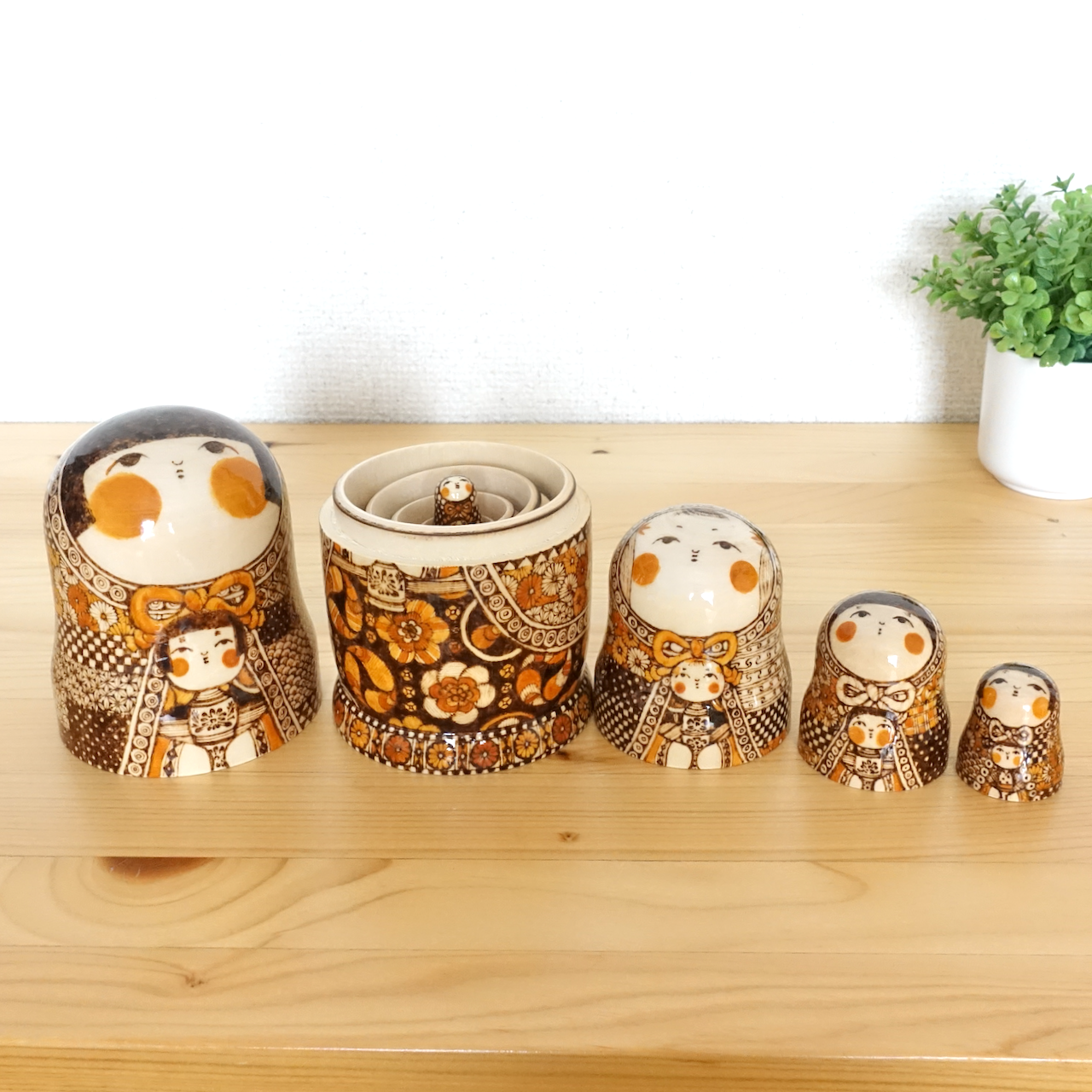 伝統文様の衣装をまとった、こけし顔の5人組マトリョーシカです。