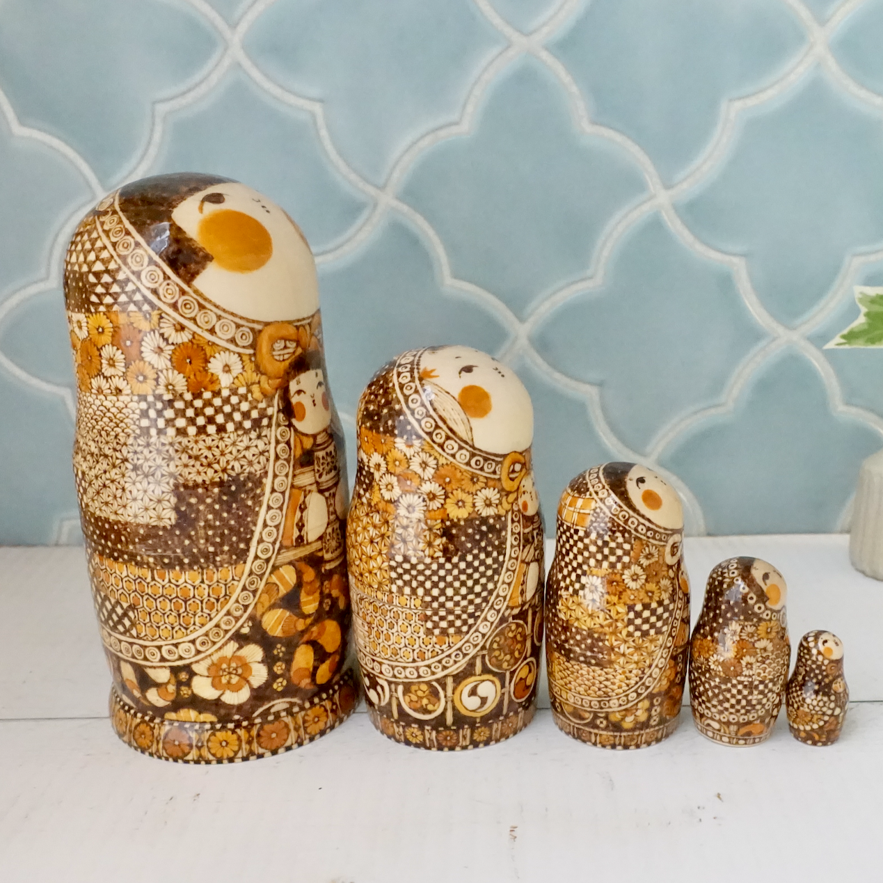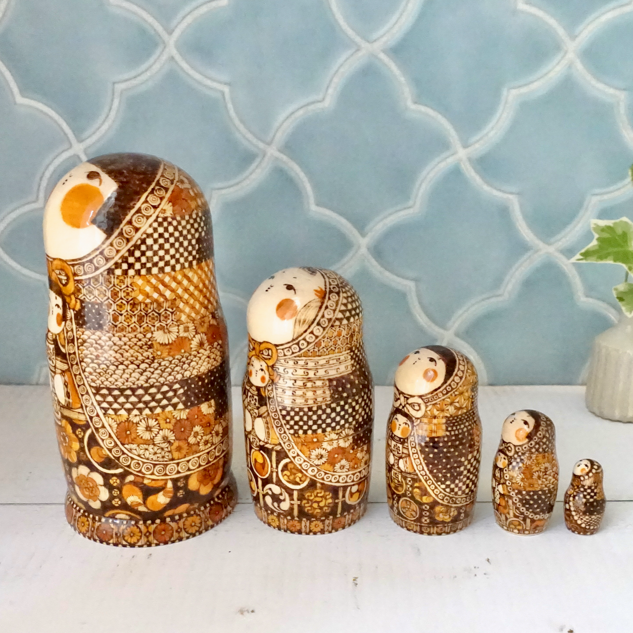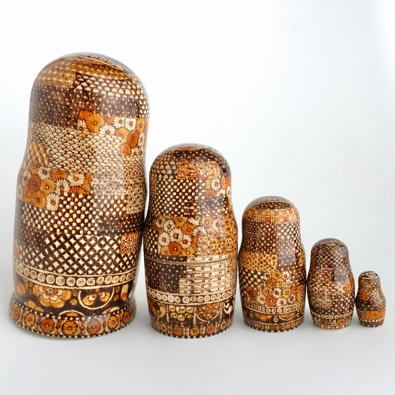 伝統文様の衣装をまとった、こけし顔の5人組マトリョーシカです。