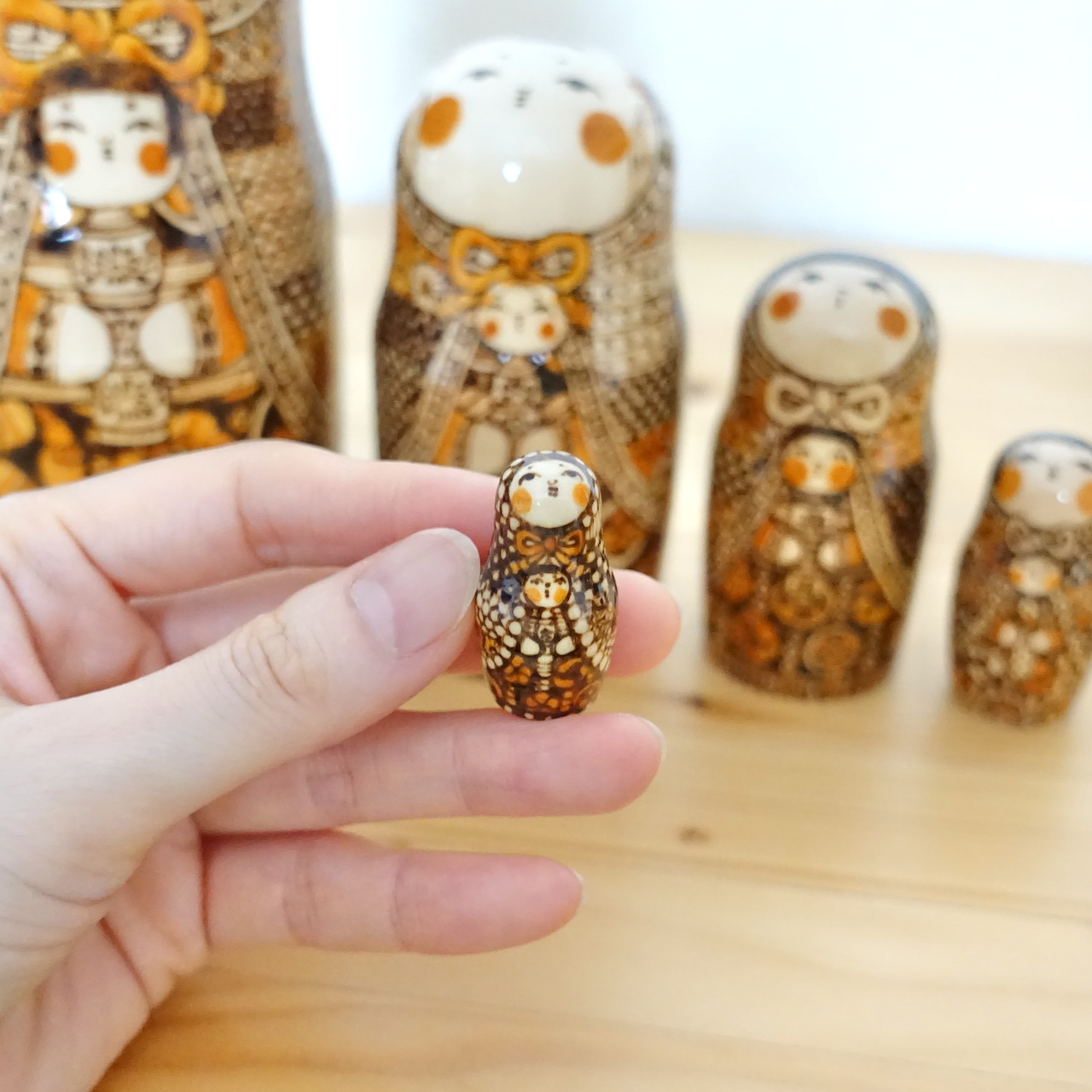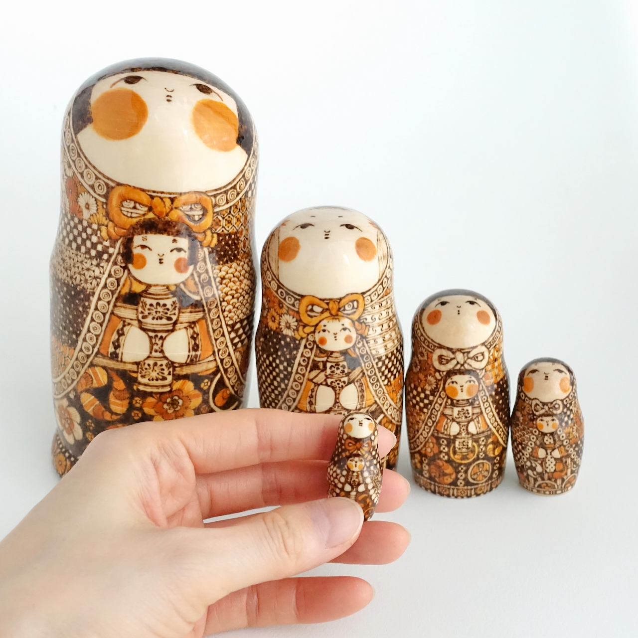 こきちや姉妹の妹さるこが、ロシア製の白木マトリョーシカに絵付けしました。