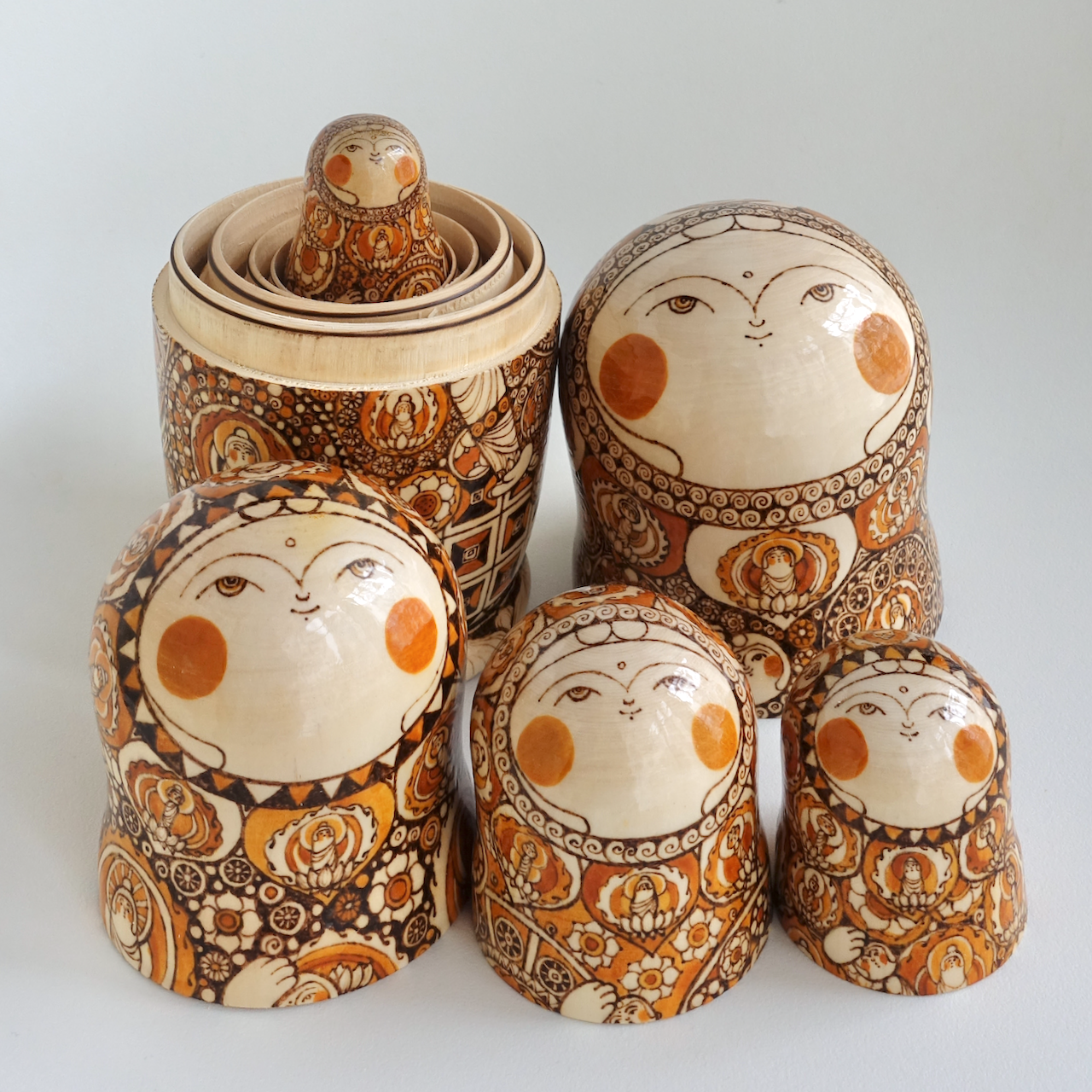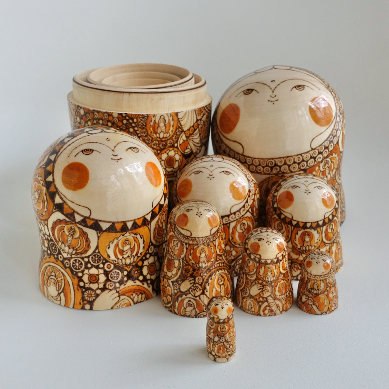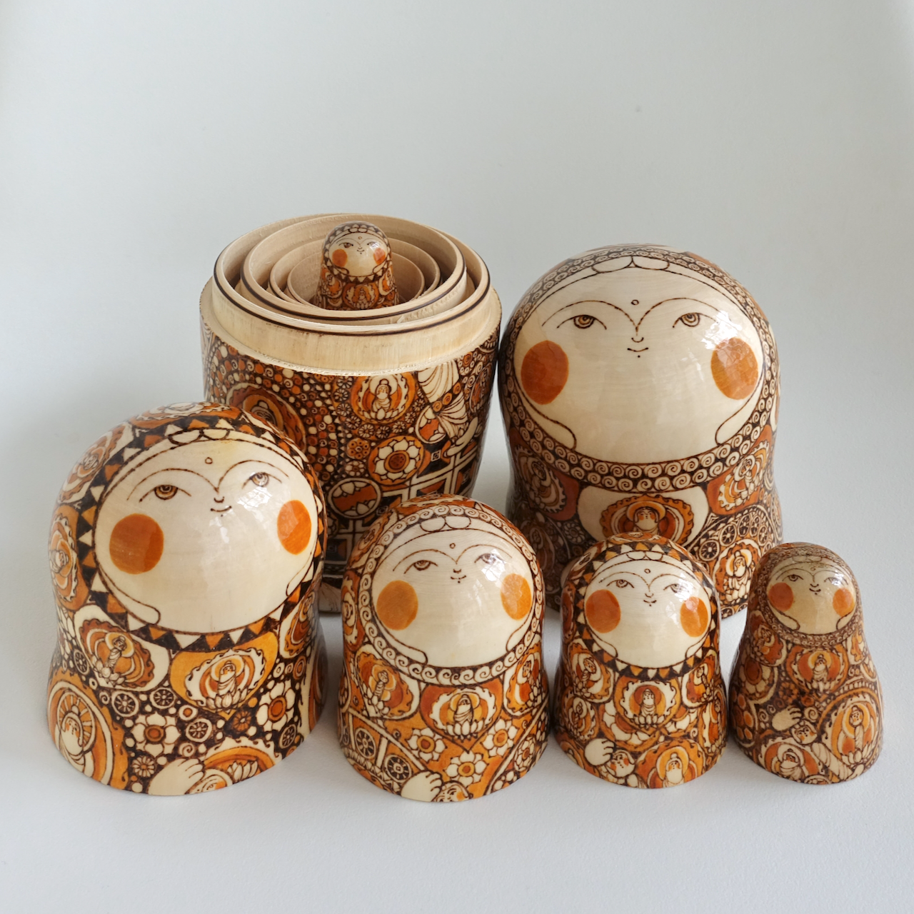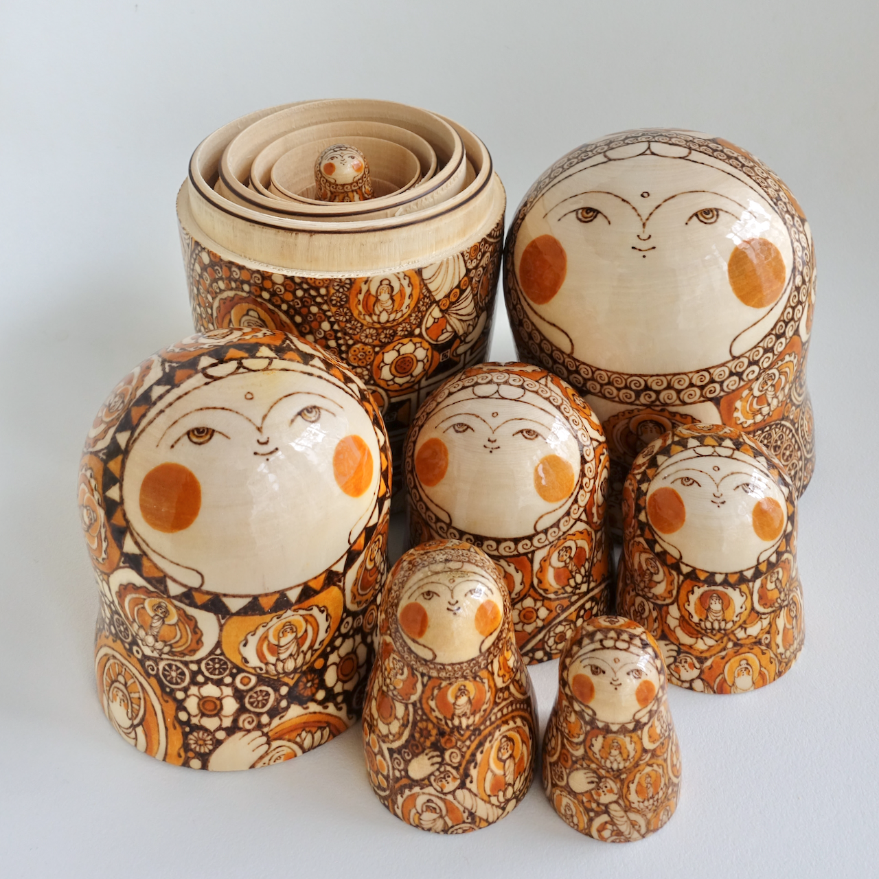 ロシア製の白木に、ウッドバーニングで絵付けをした8人組のマトリョーシカです。