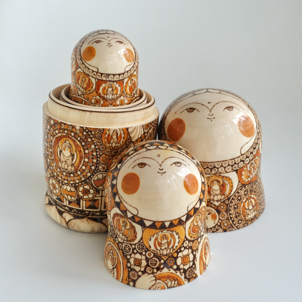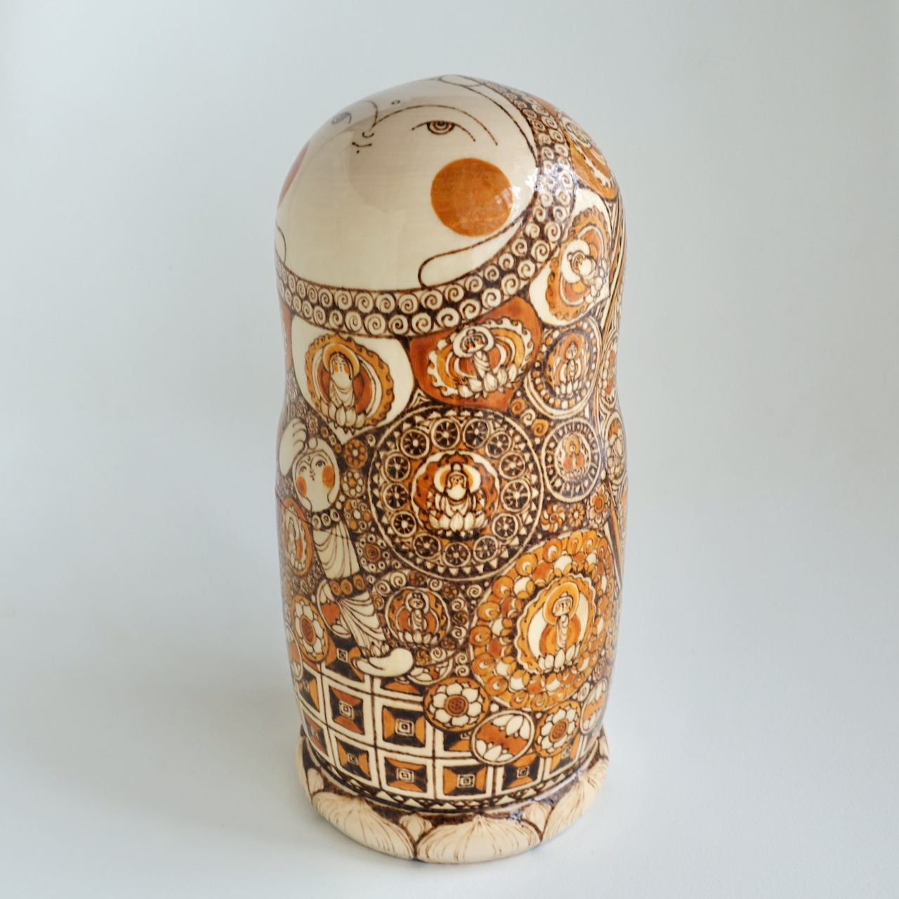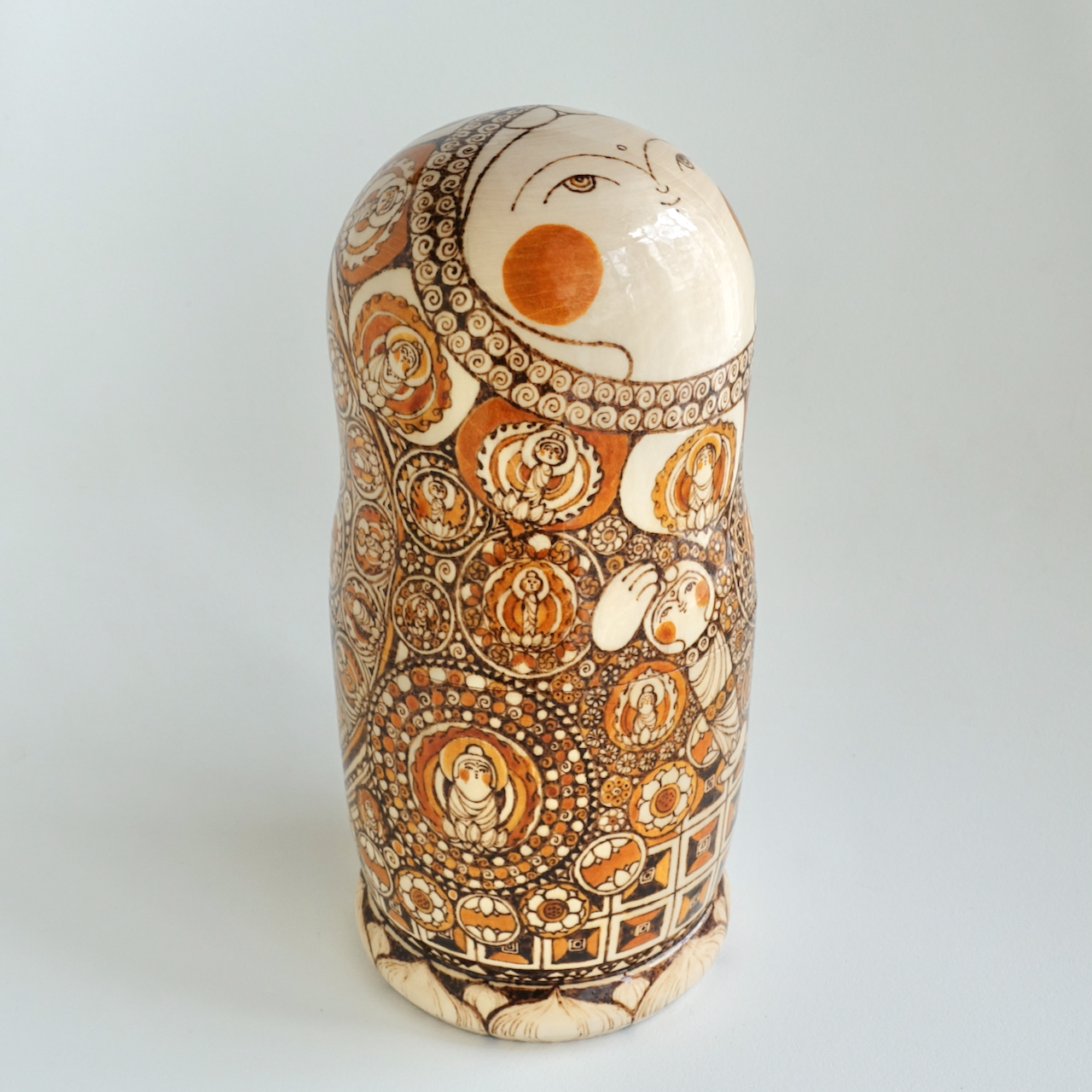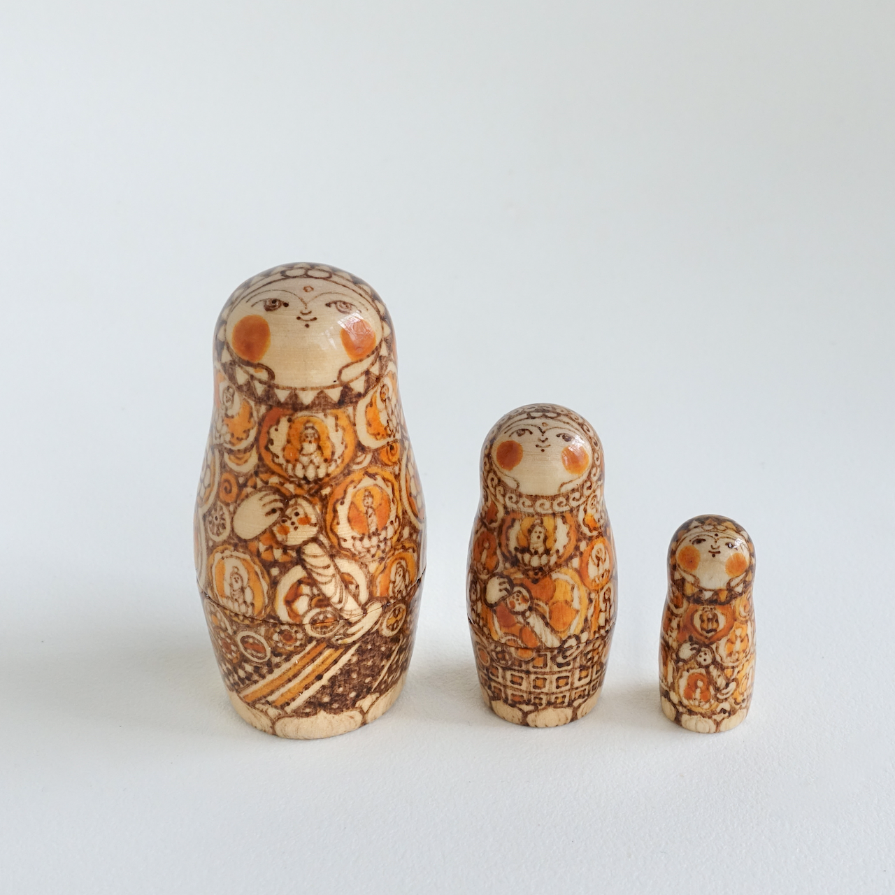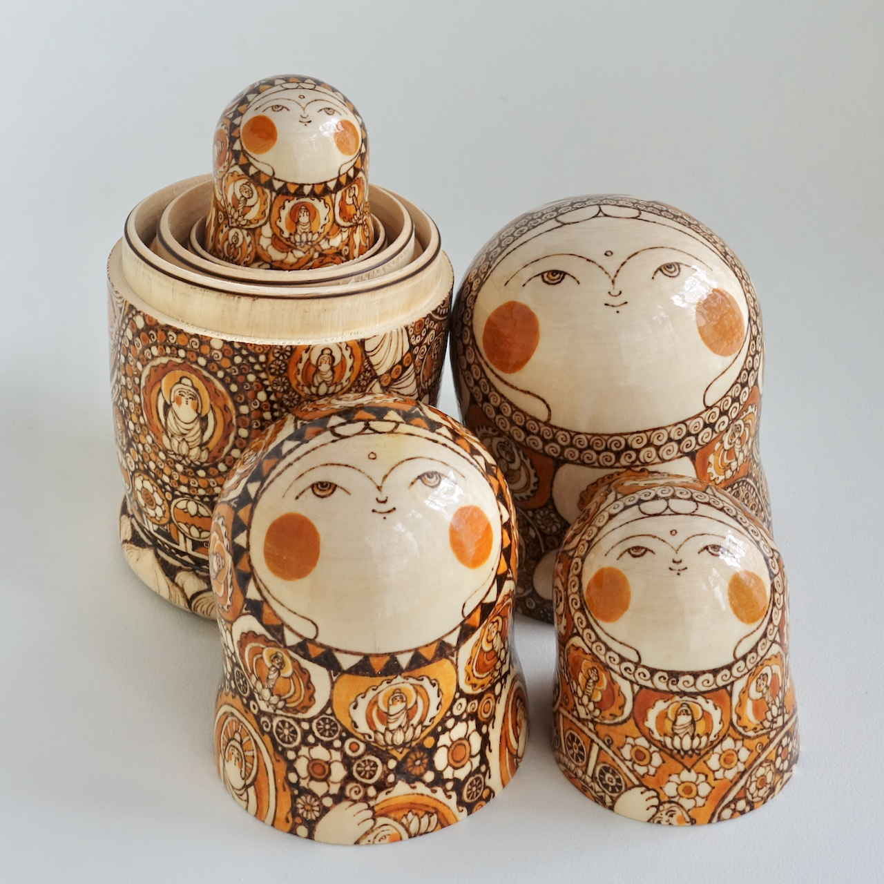 ロシア製の白木に、ウッドバーニングで絵付けをした8人組のマトリョーシカです。