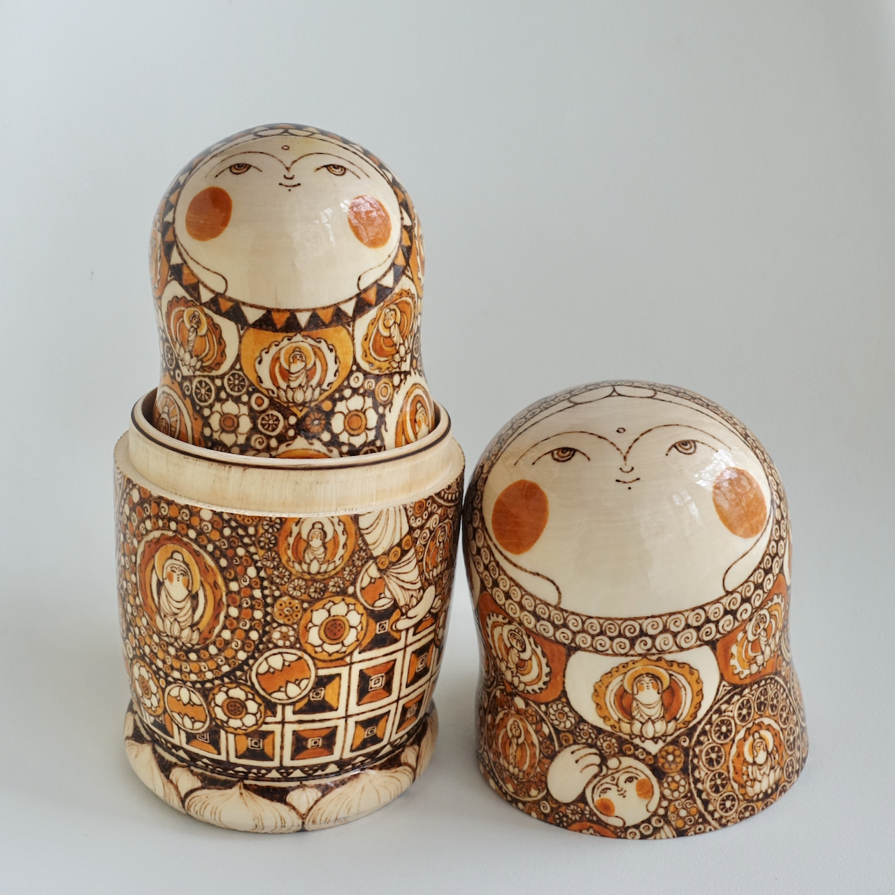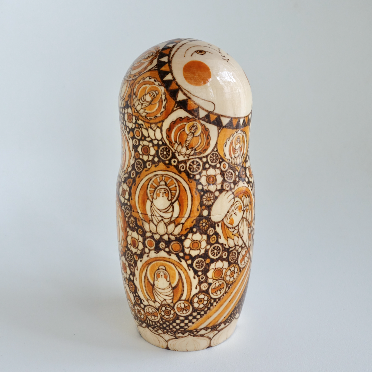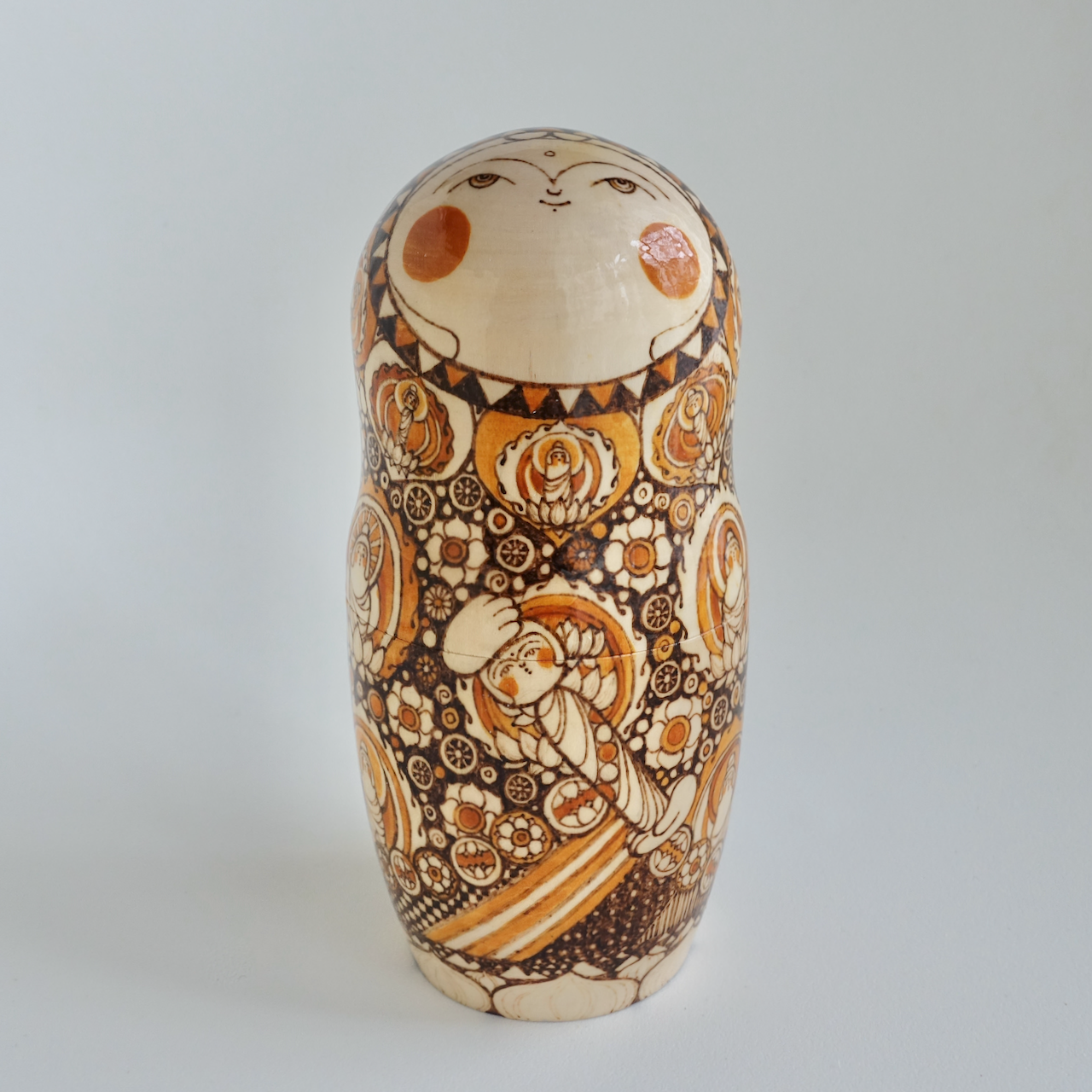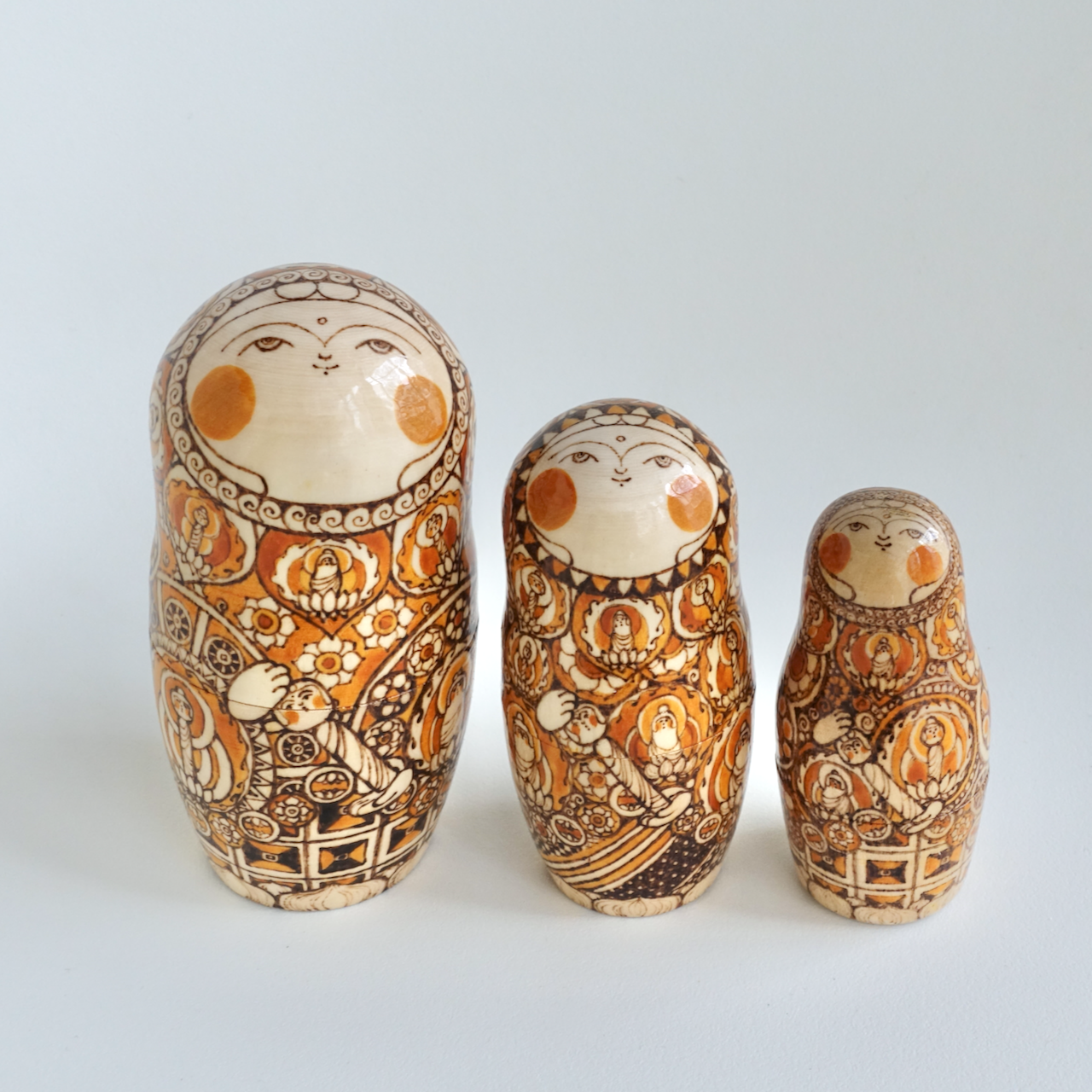ロシア製の白木に、ウッドバーニングで絵付けをした8人組のマトリョーシカです。