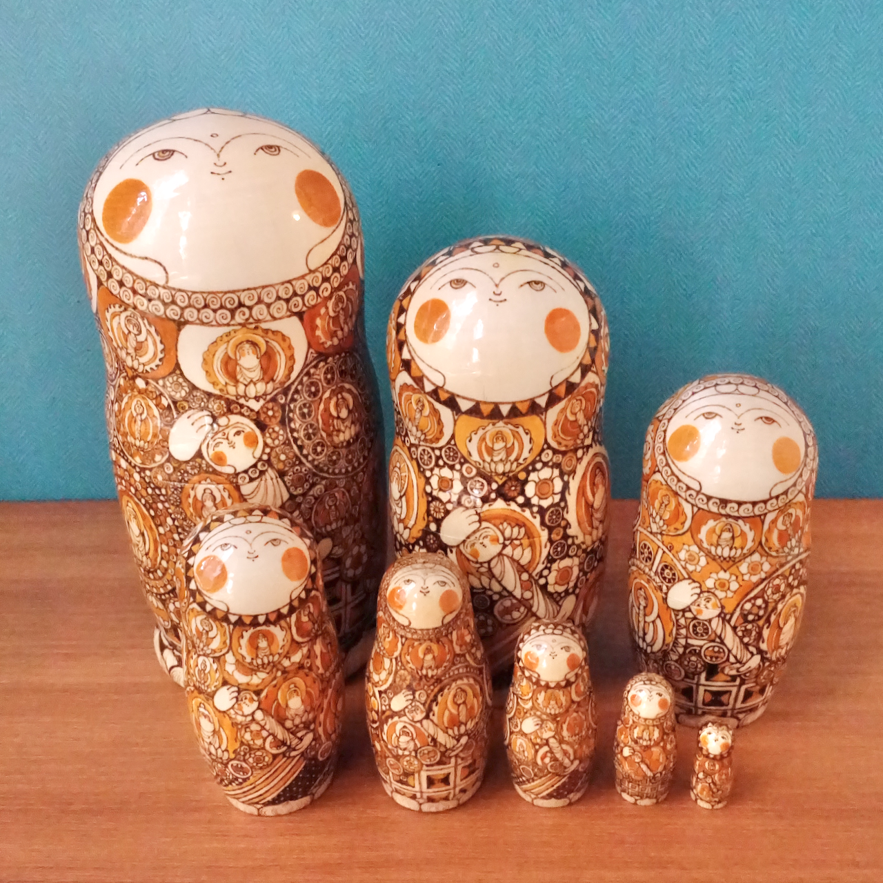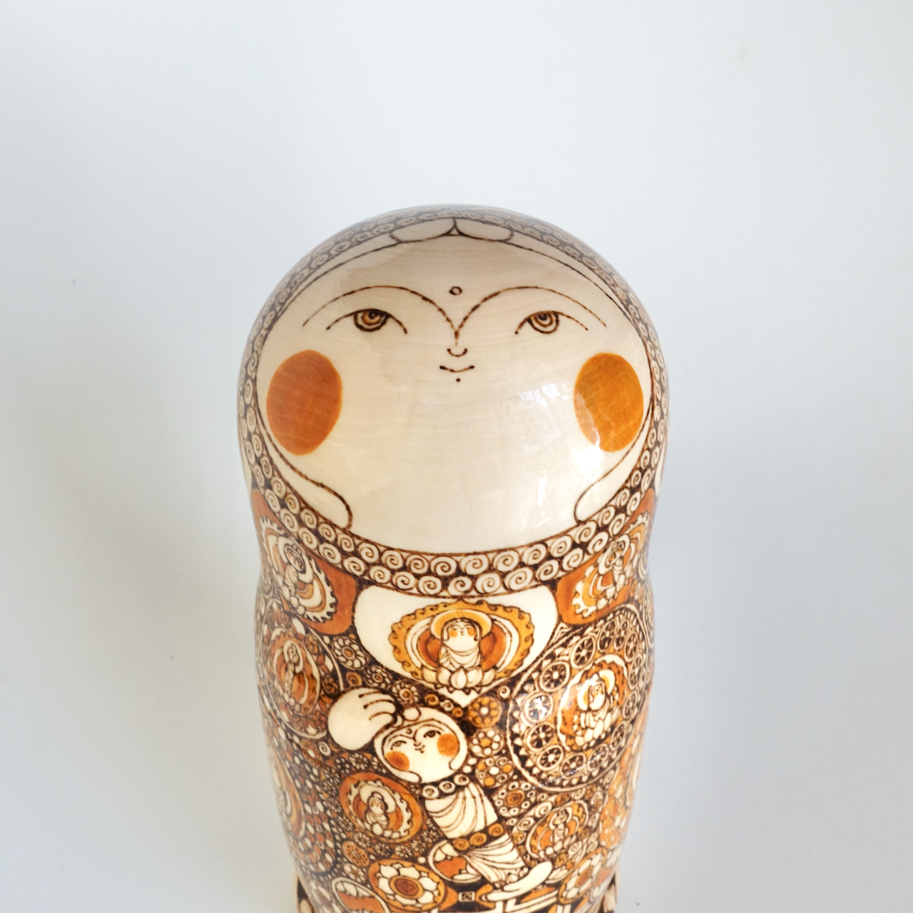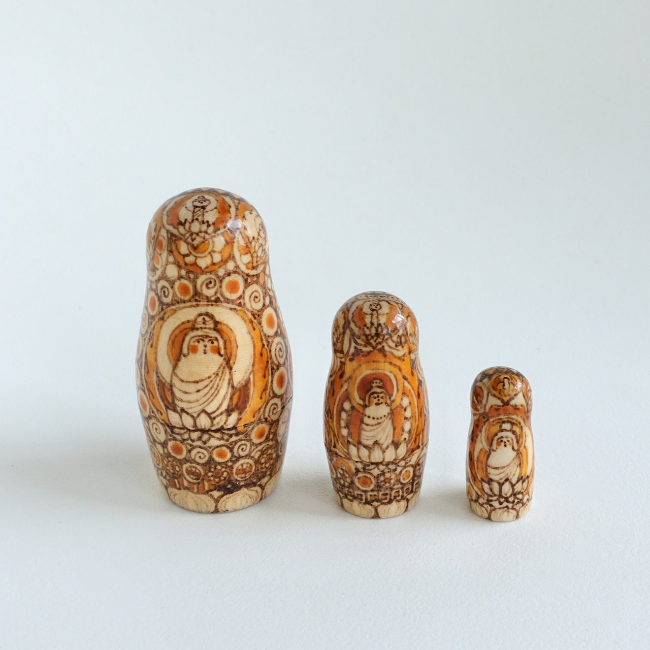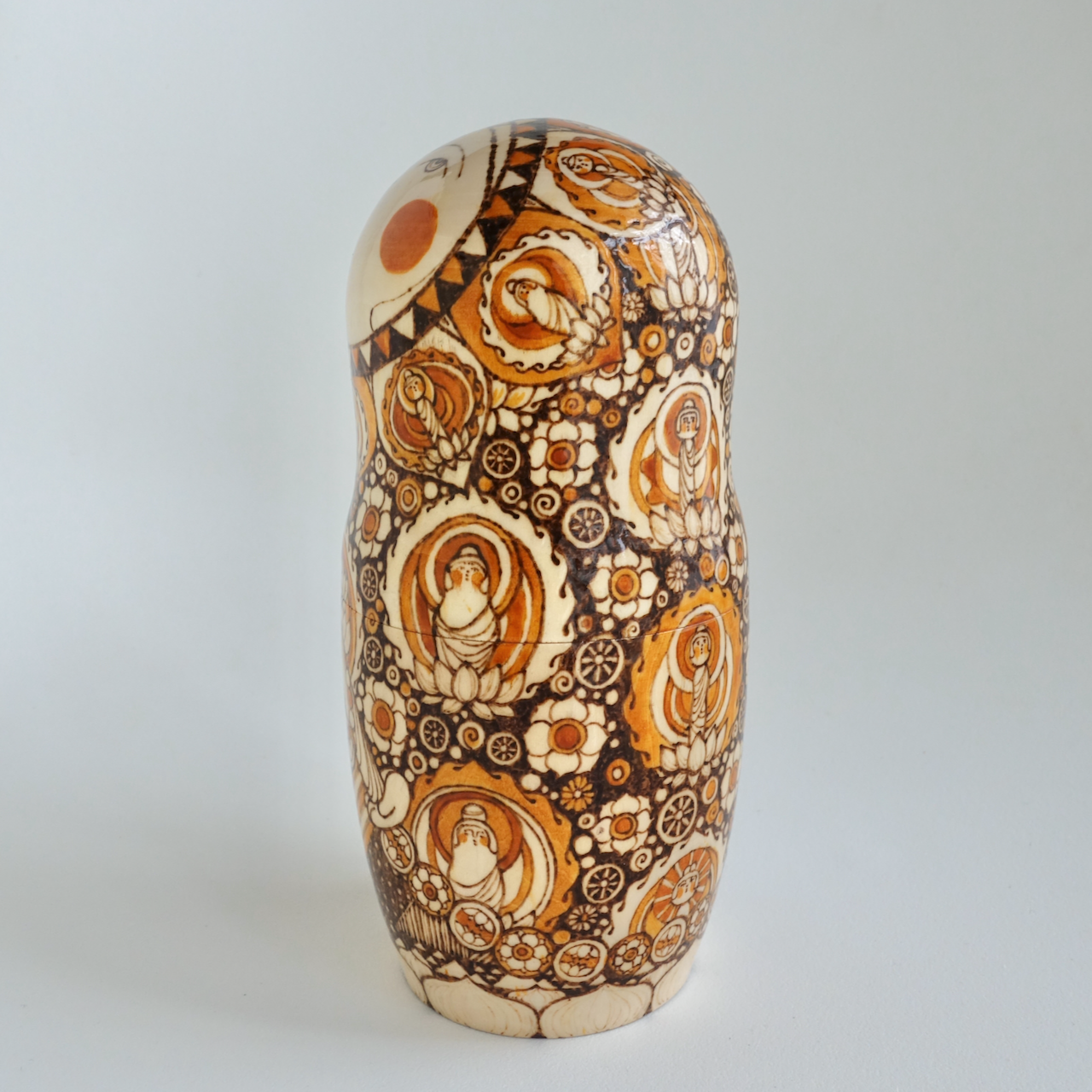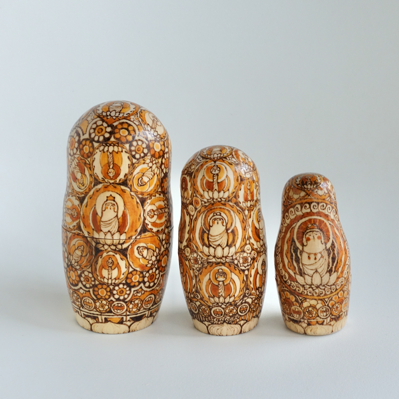 ロシア製の白木に、ウッドバーニングで絵付けをした8人組のマトリョーシカです。