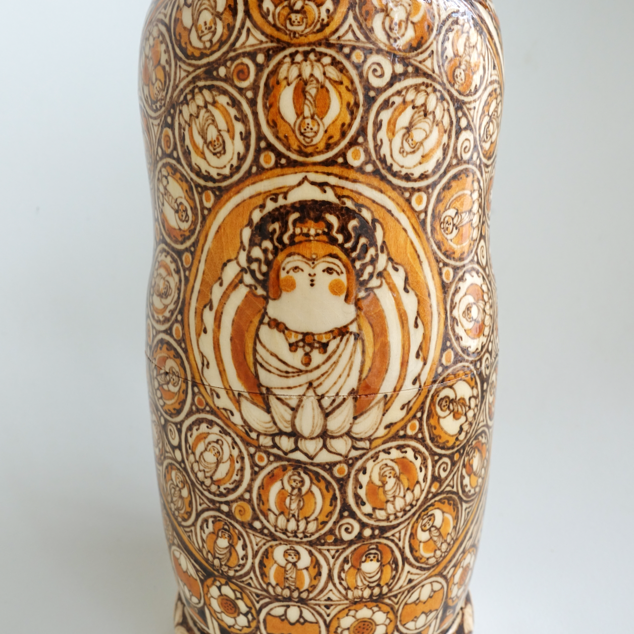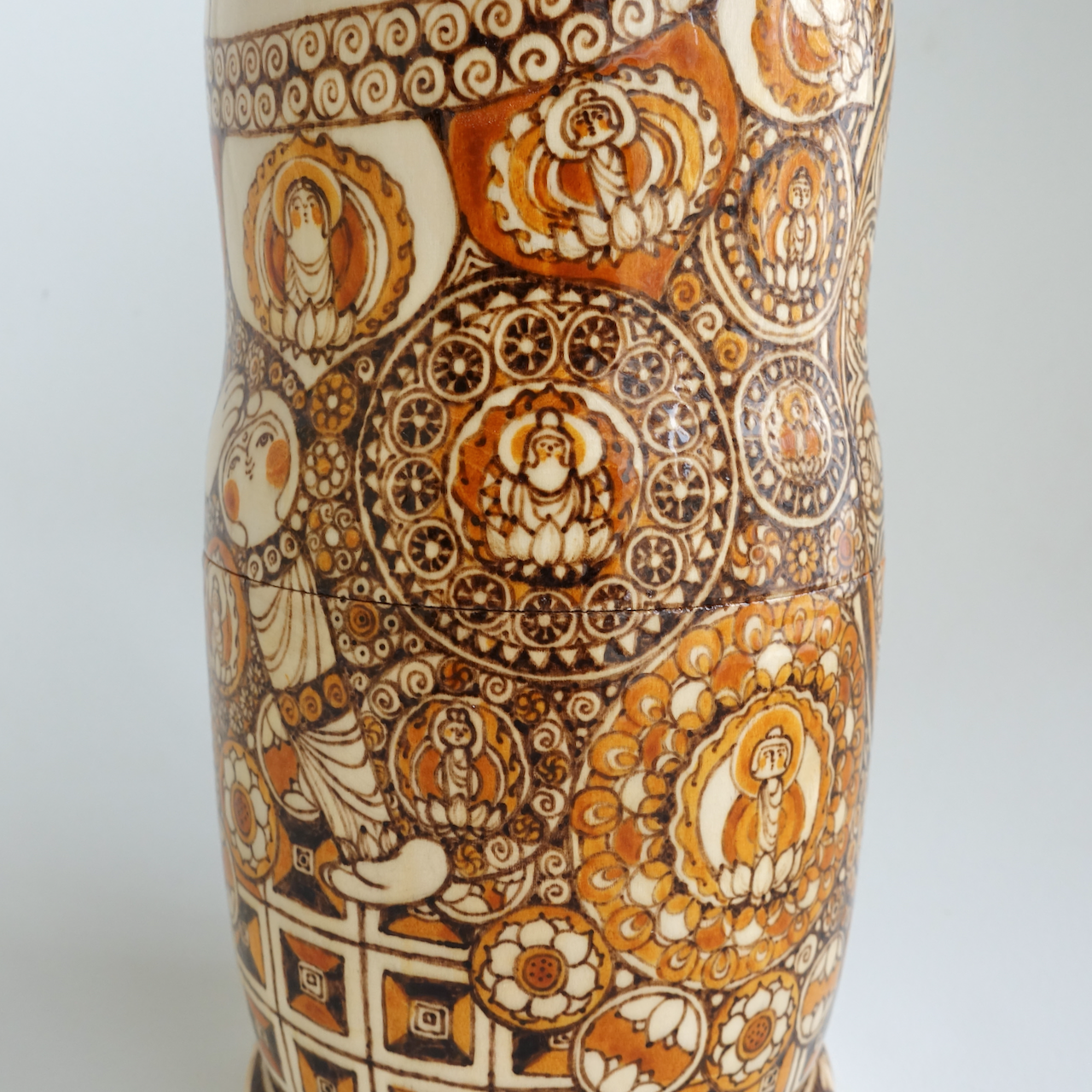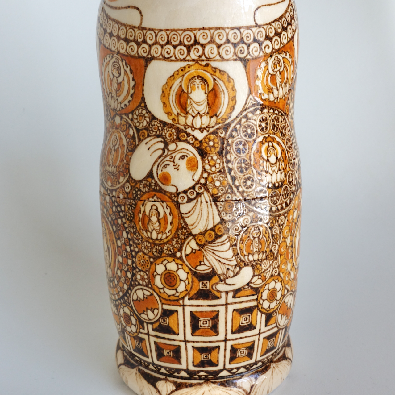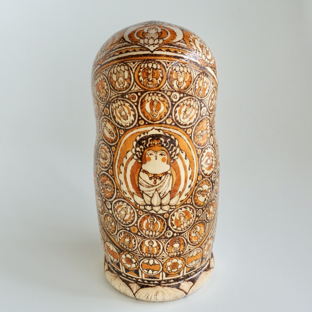 ロシア製の白木に、ウッドバーニングで絵付けをした8人組のマトリョーシカです。