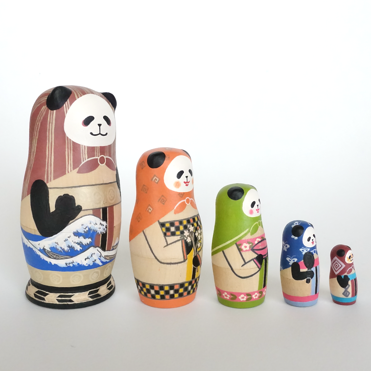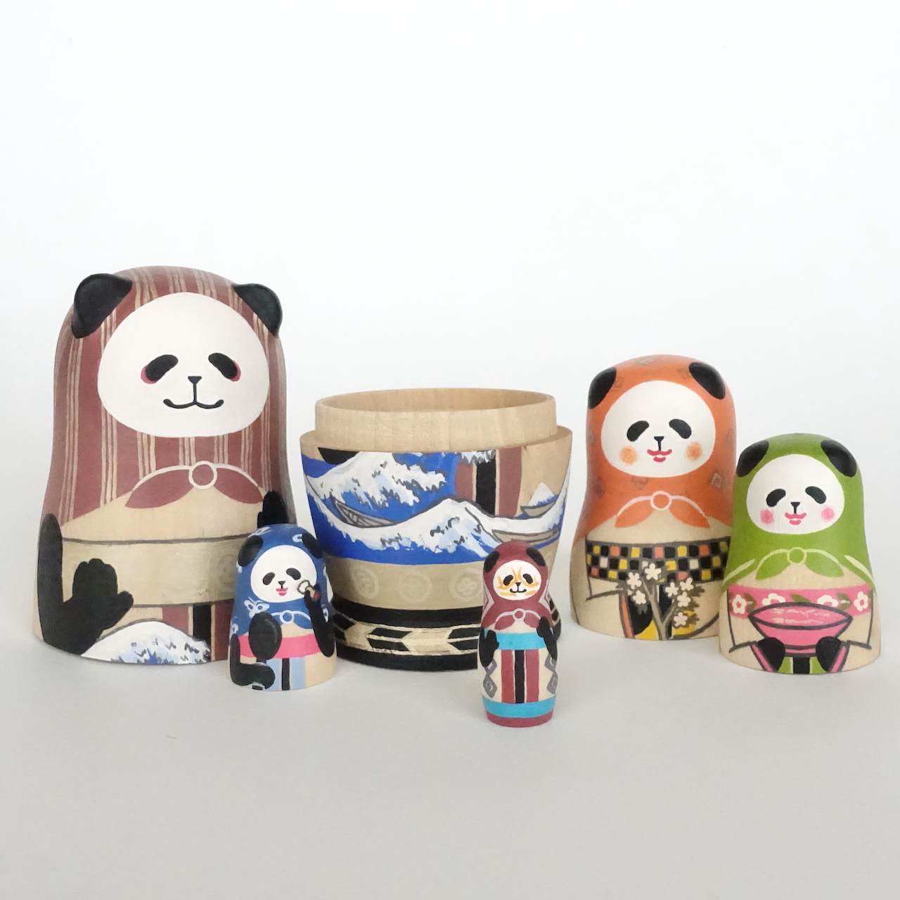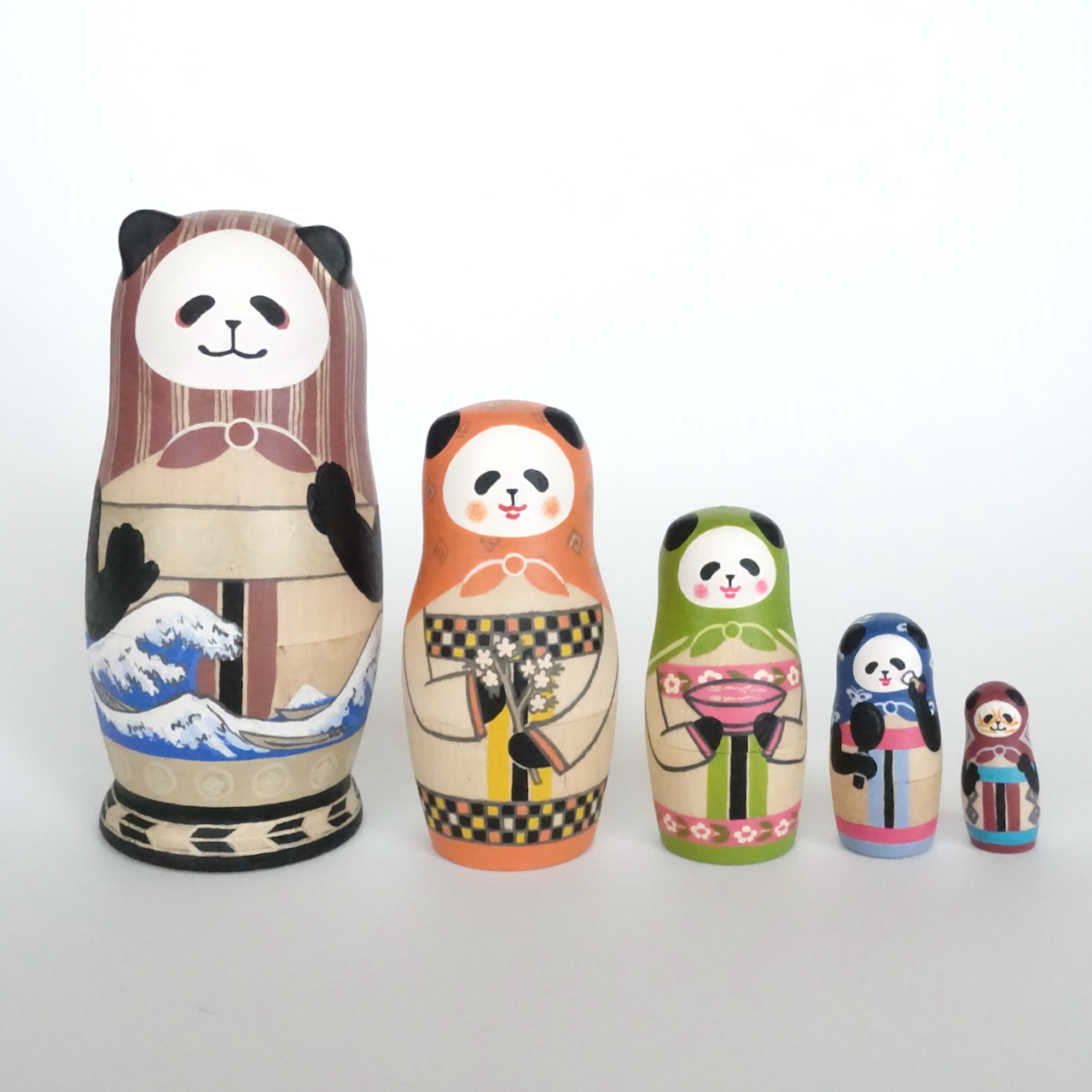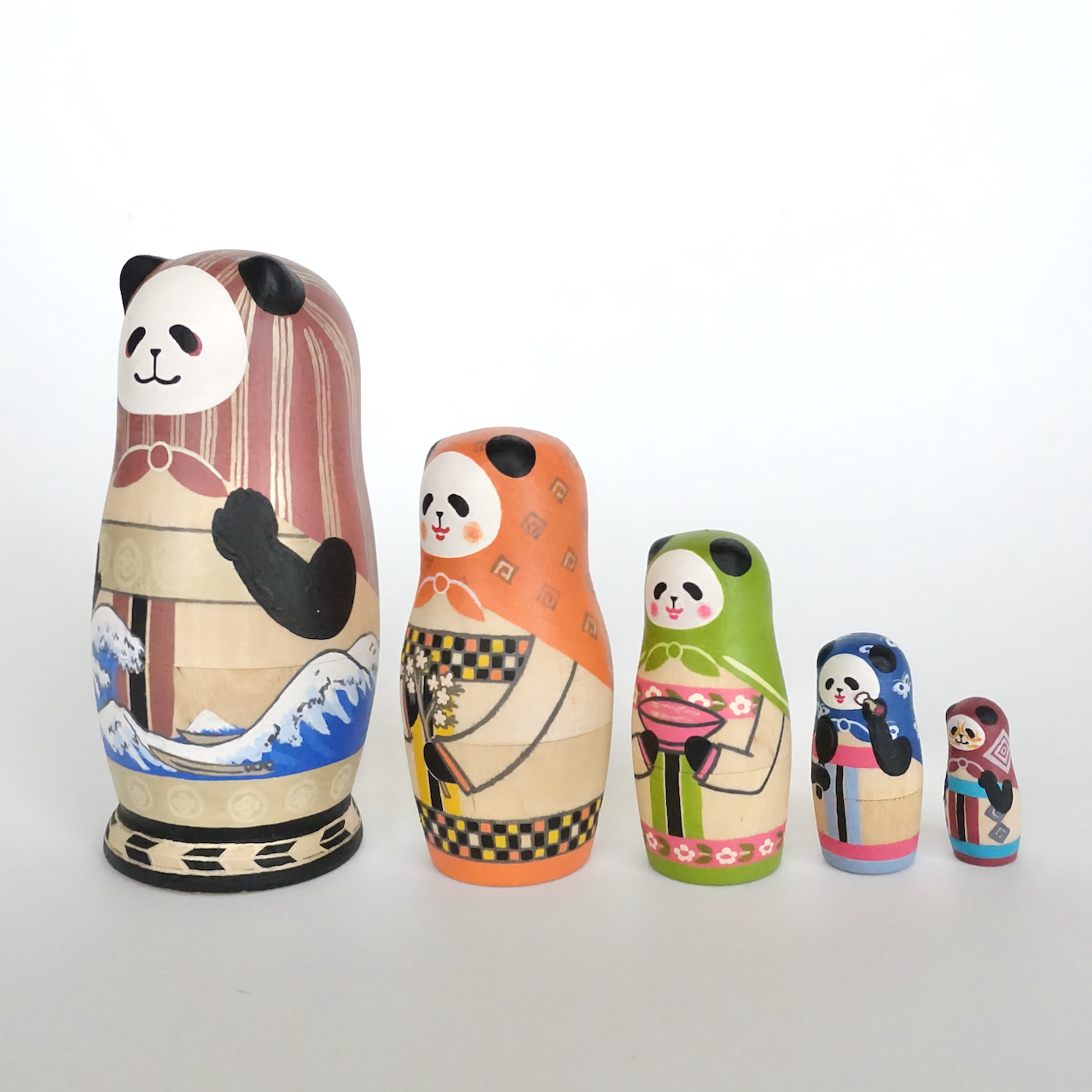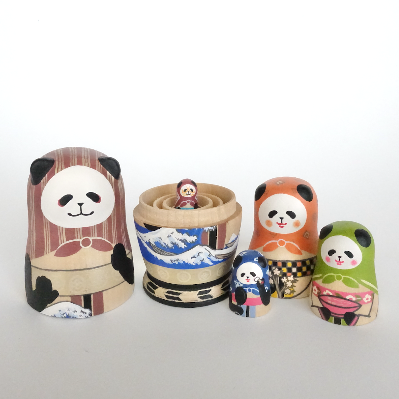 5人組のパンダ・マトリョーシカです。木地に粘土で耳をつけ、ヤスリで磨いてなじませて下地を作り、アクリル絵の具で絵付けしました。