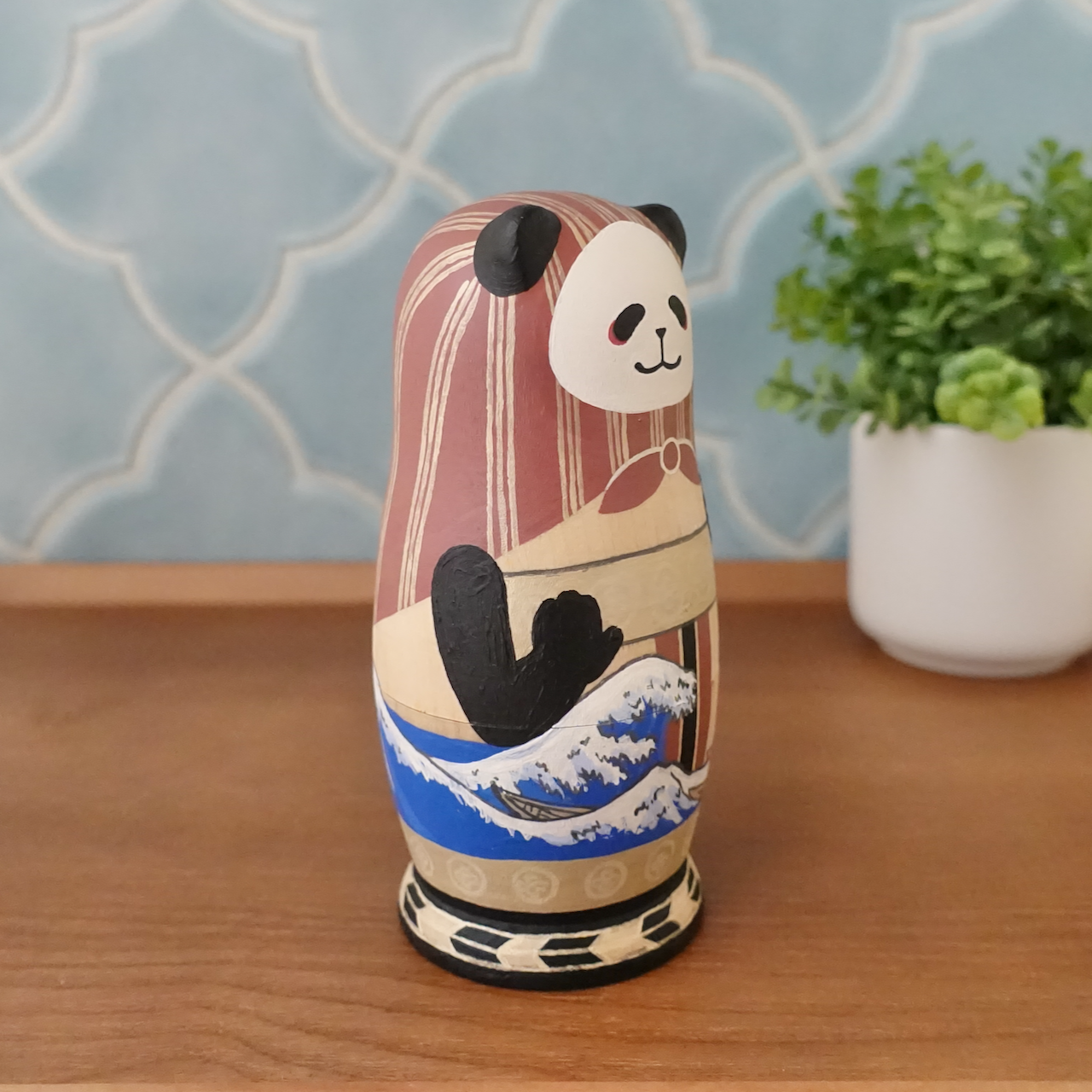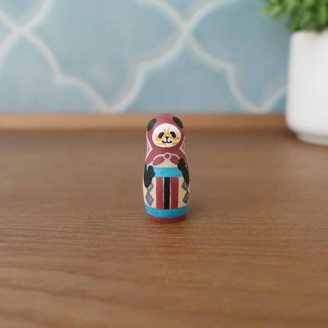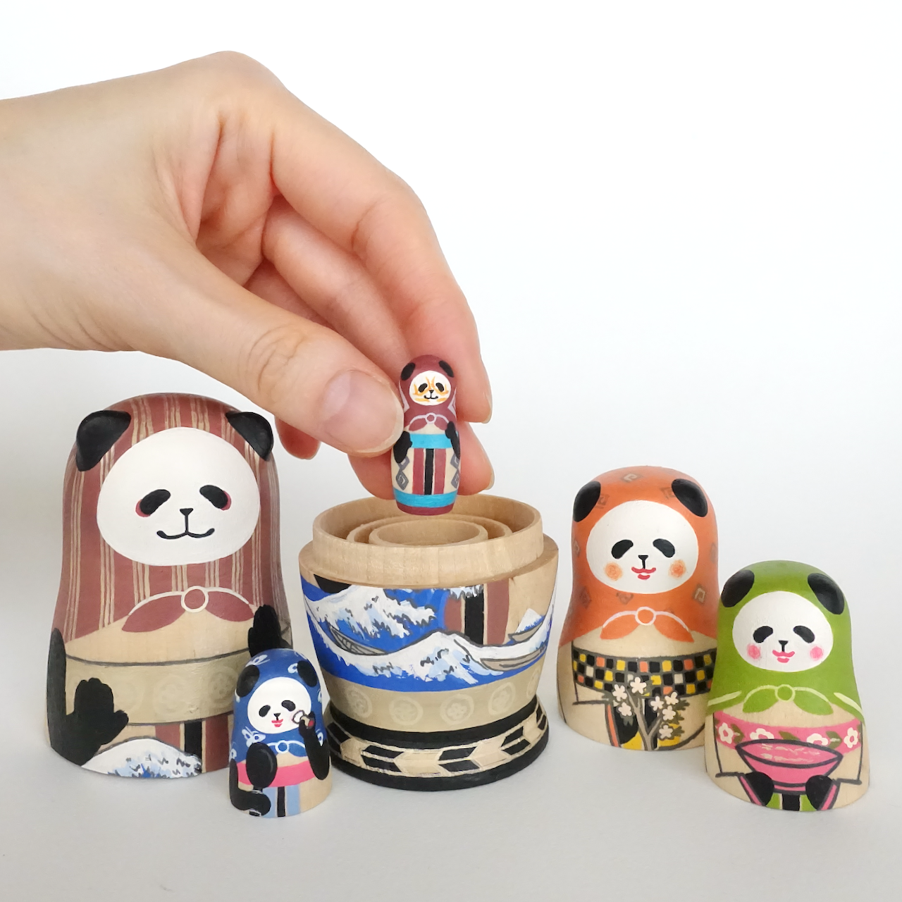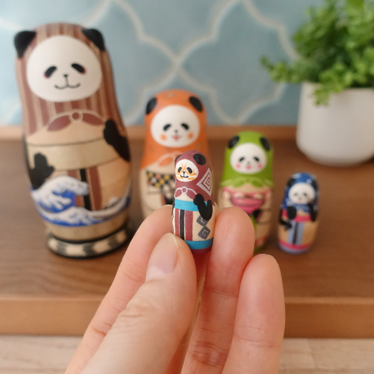 5人組のパンダ・マトリョーシカです。木地に粘土で耳をつけ、ヤスリで磨いてなじませて下地を作り、アクリル絵の具で絵付けしました。