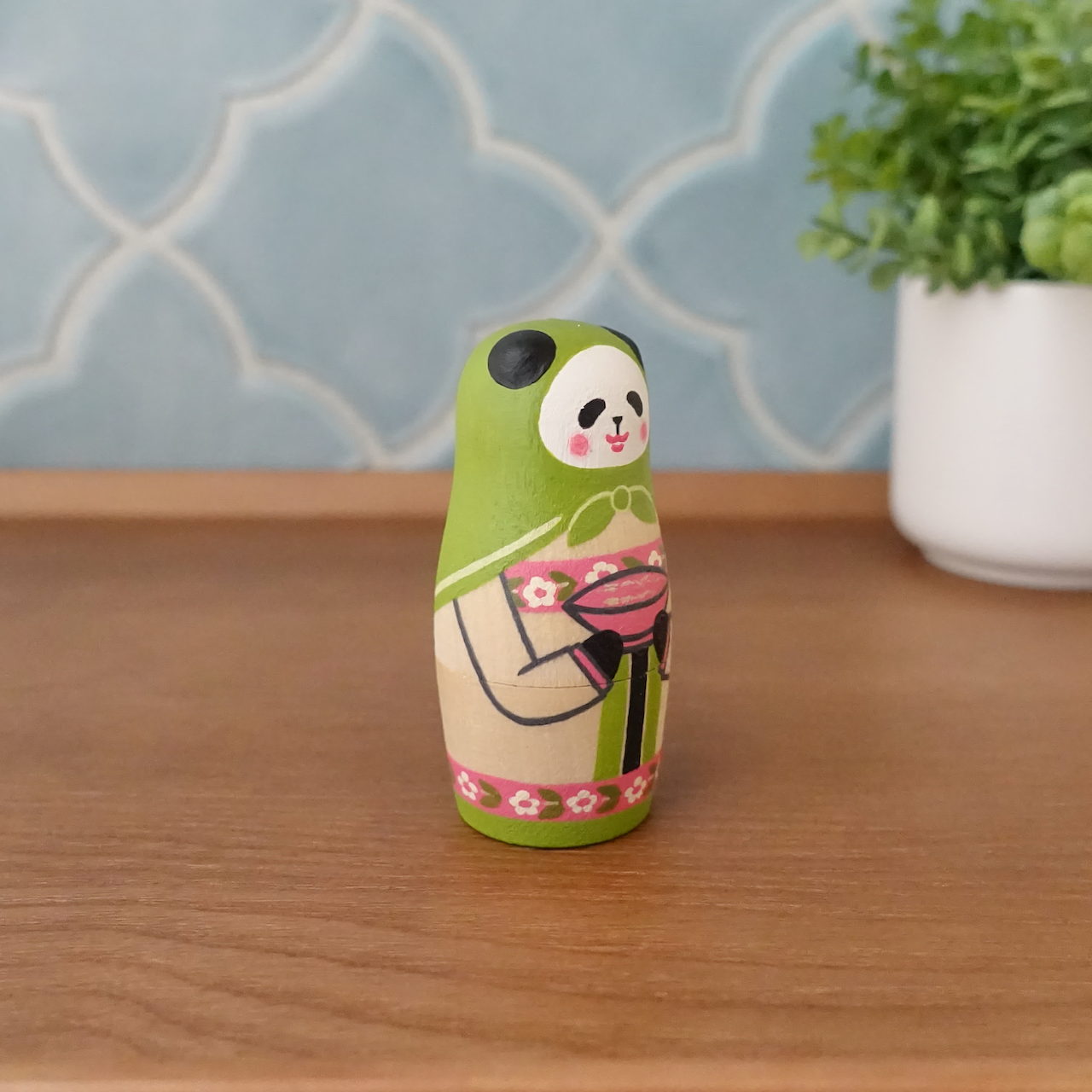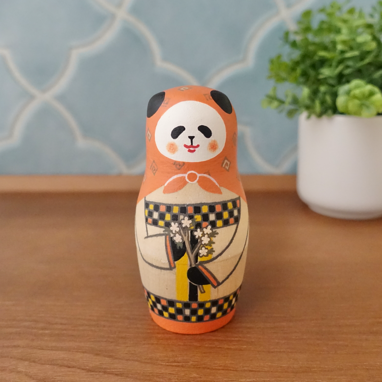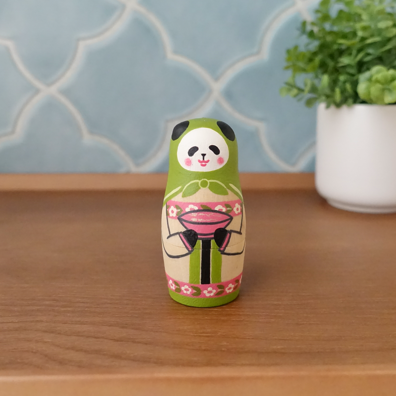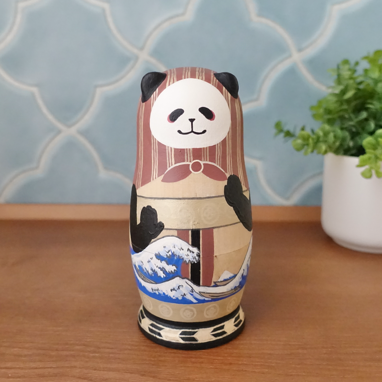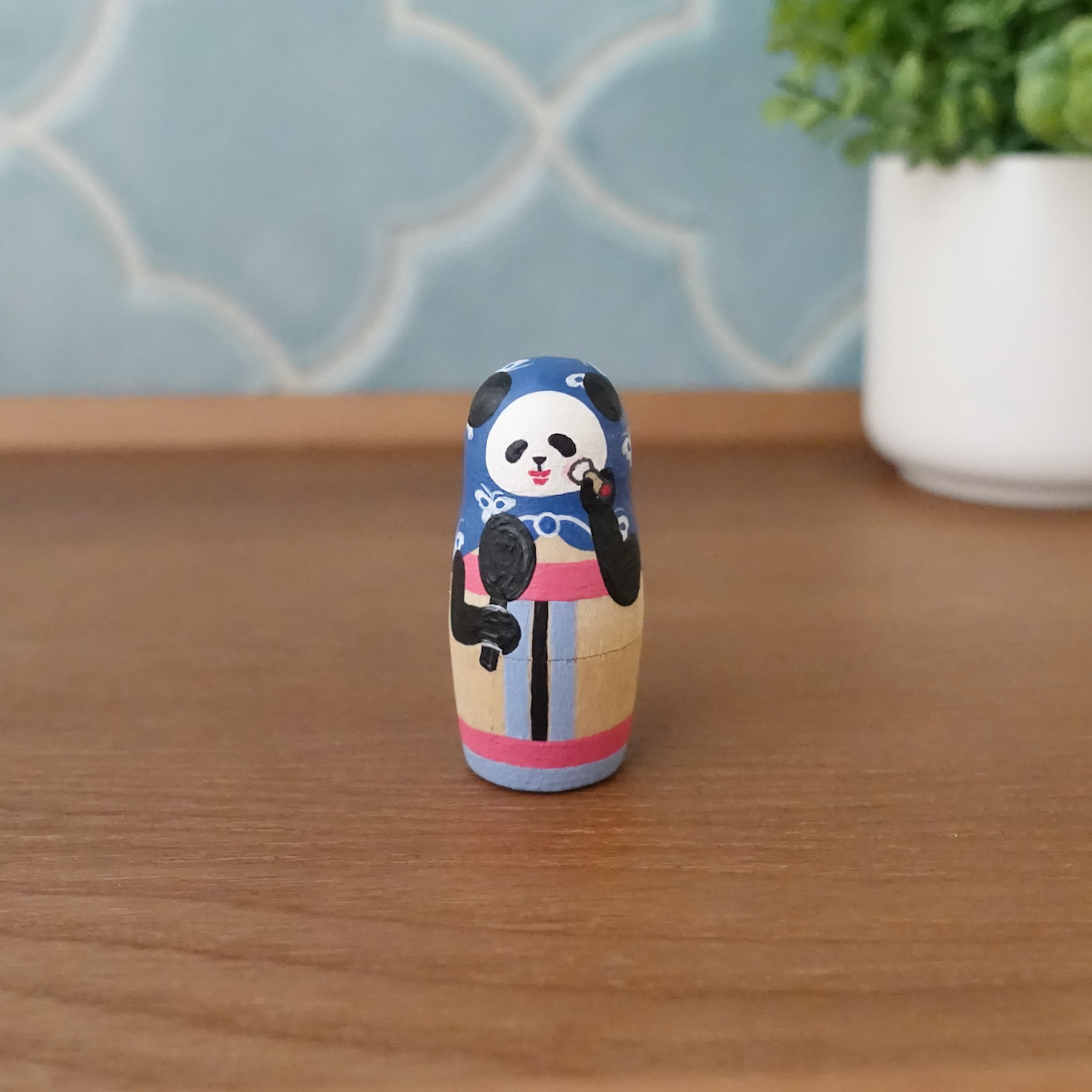 5人組のパンダ・マトリョーシカです。木地に粘土で耳をつけ、ヤスリで磨いてなじませて下地を作り、アクリル絵の具で絵付けしました。