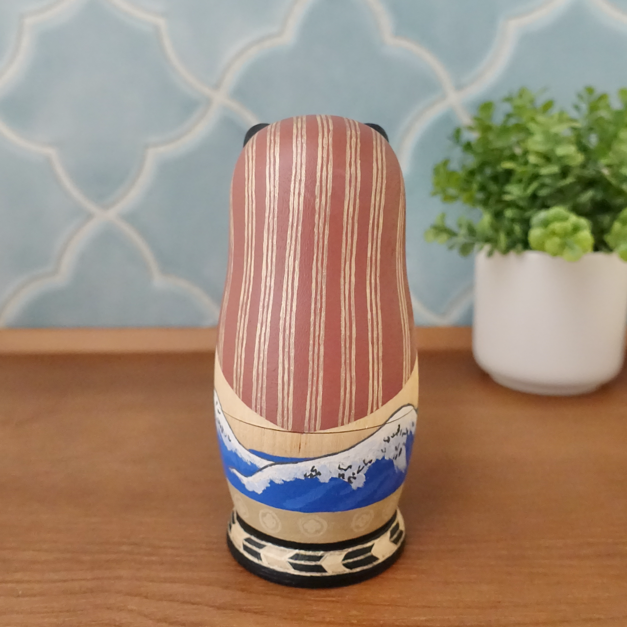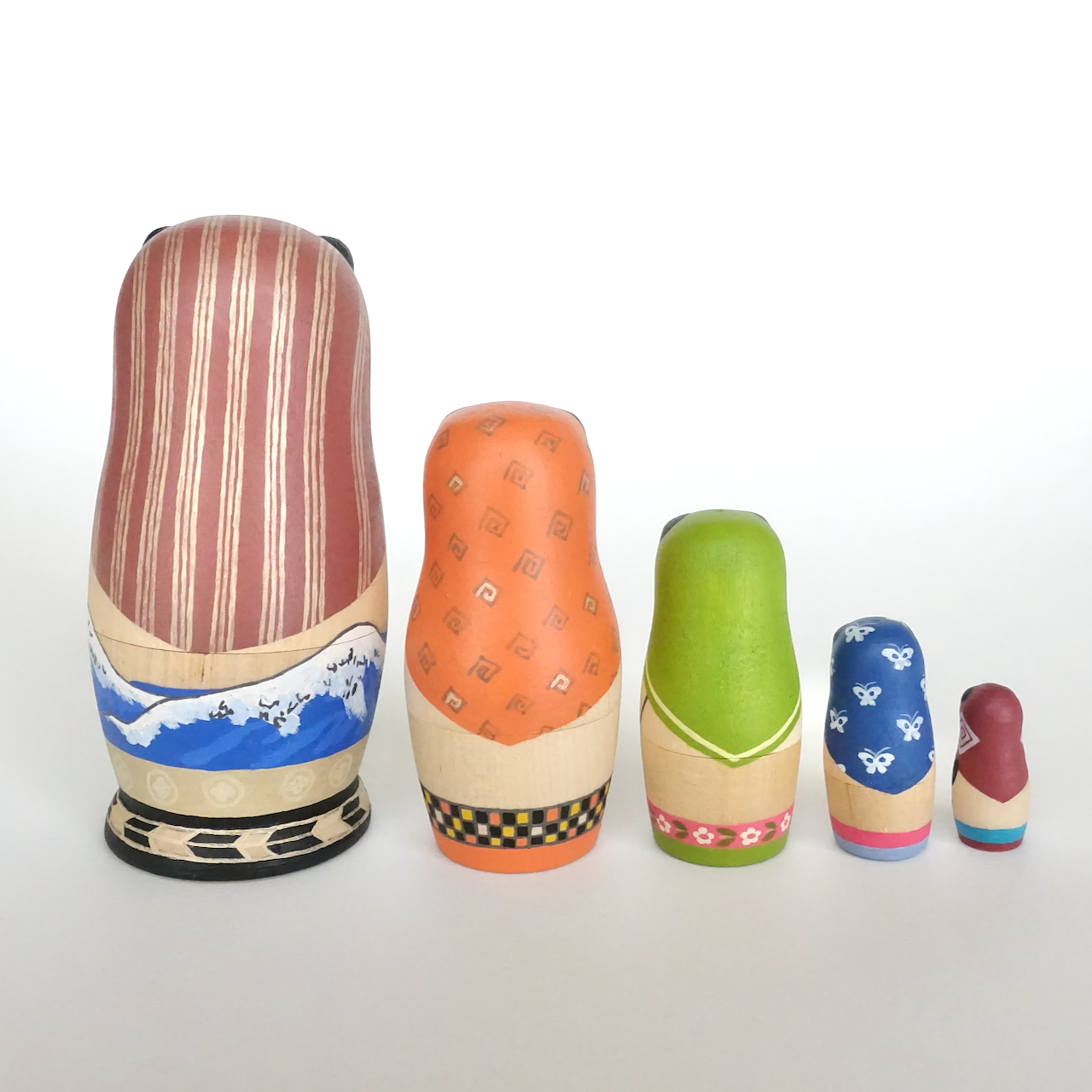 浮世絵の表情やポーズ、着物の柄や小物を組み合わせ、マトリョーシカの木肌部分を活かすデザインにしました。