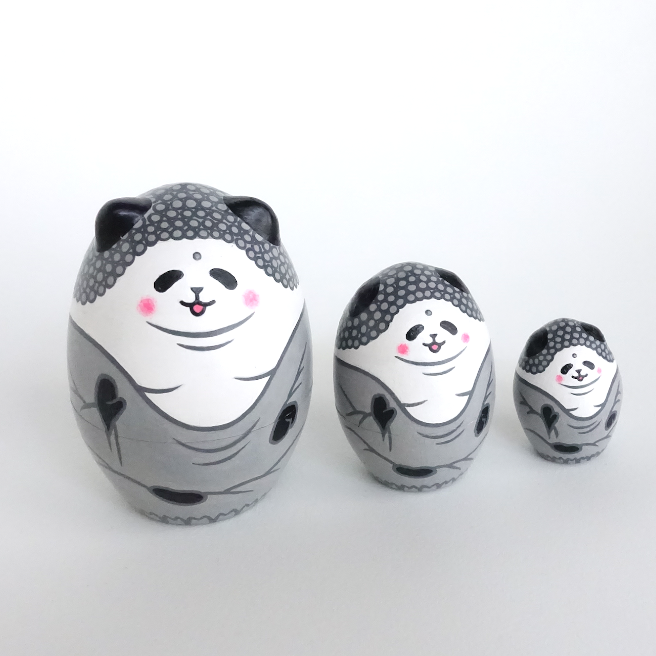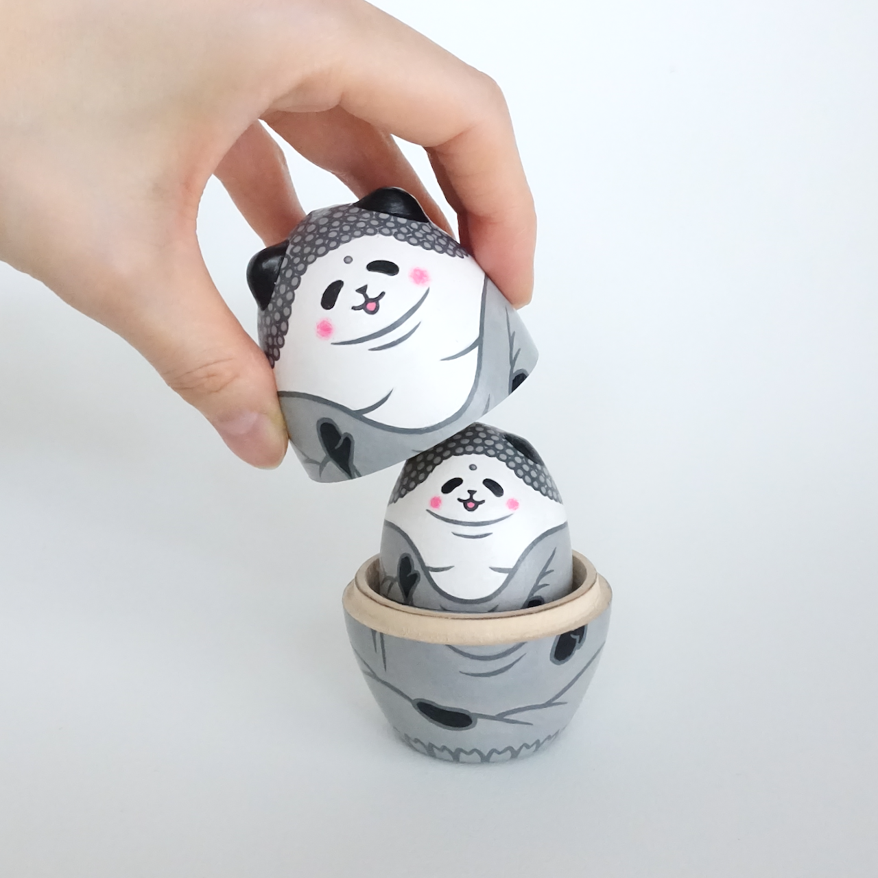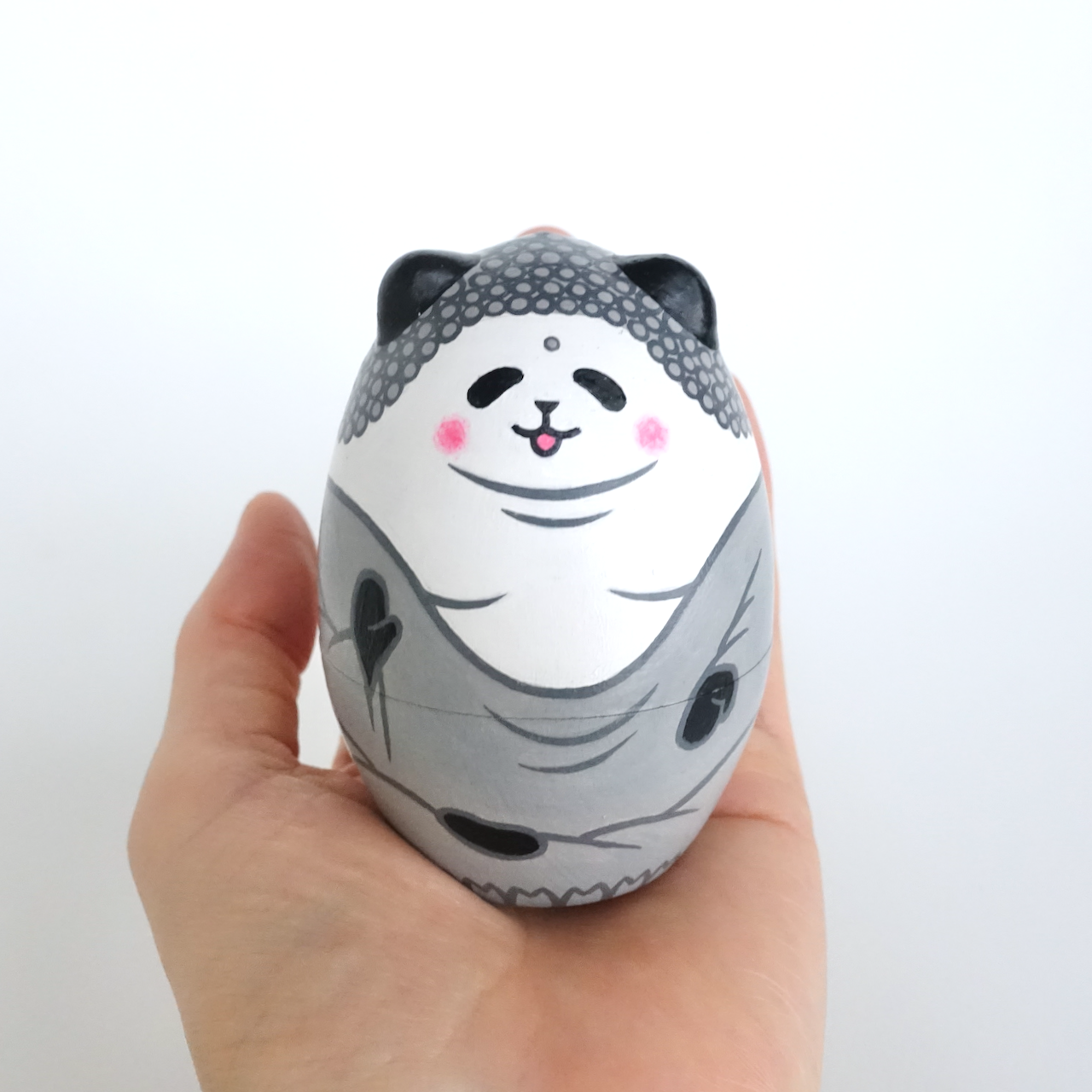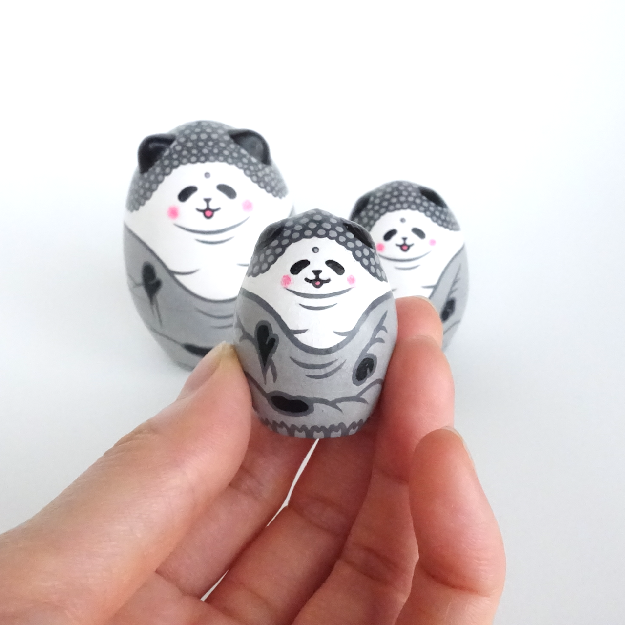 ロシア製のたまご形の木地に、パンダの耳を粘土で造形し、アクリル絵の具で絵付けしました。