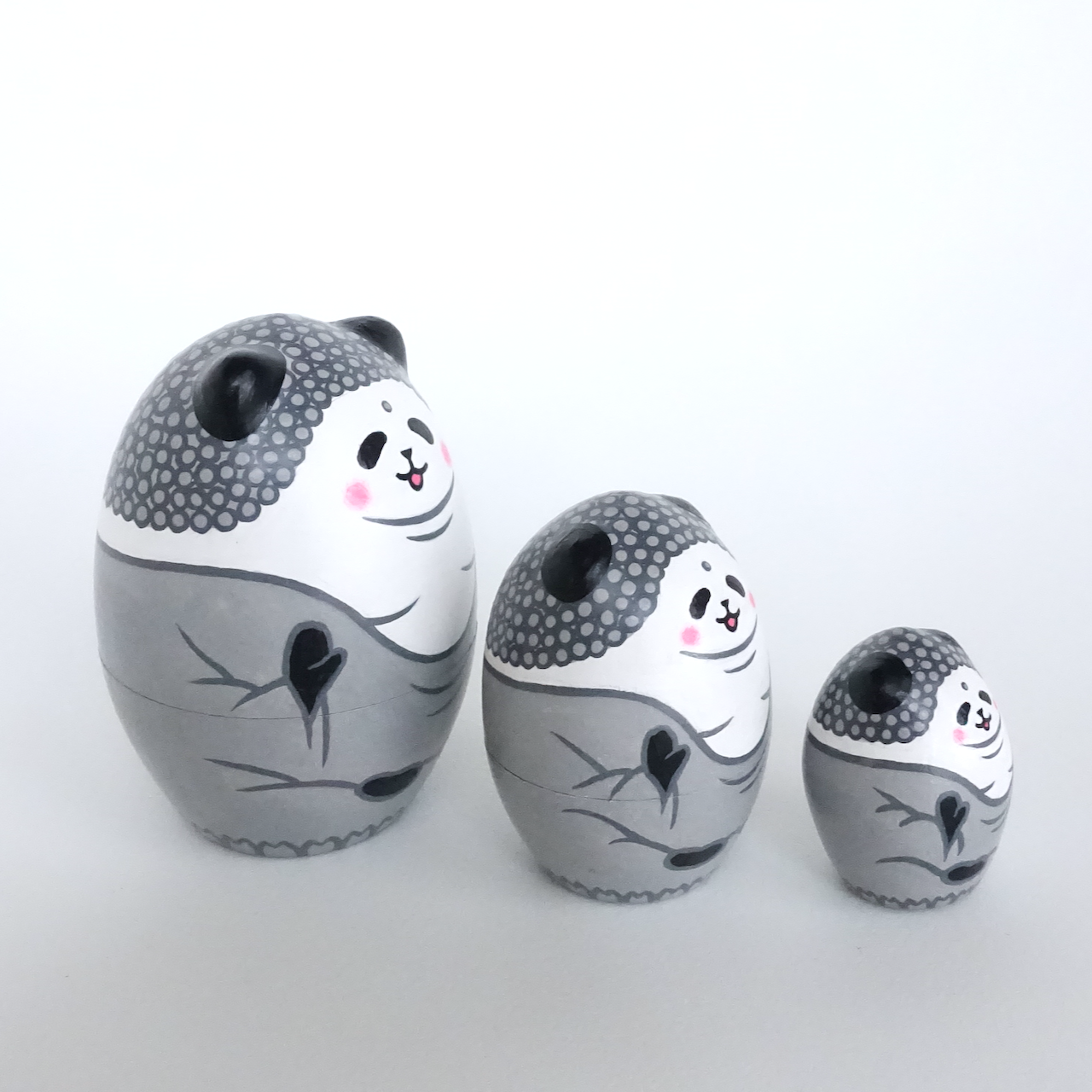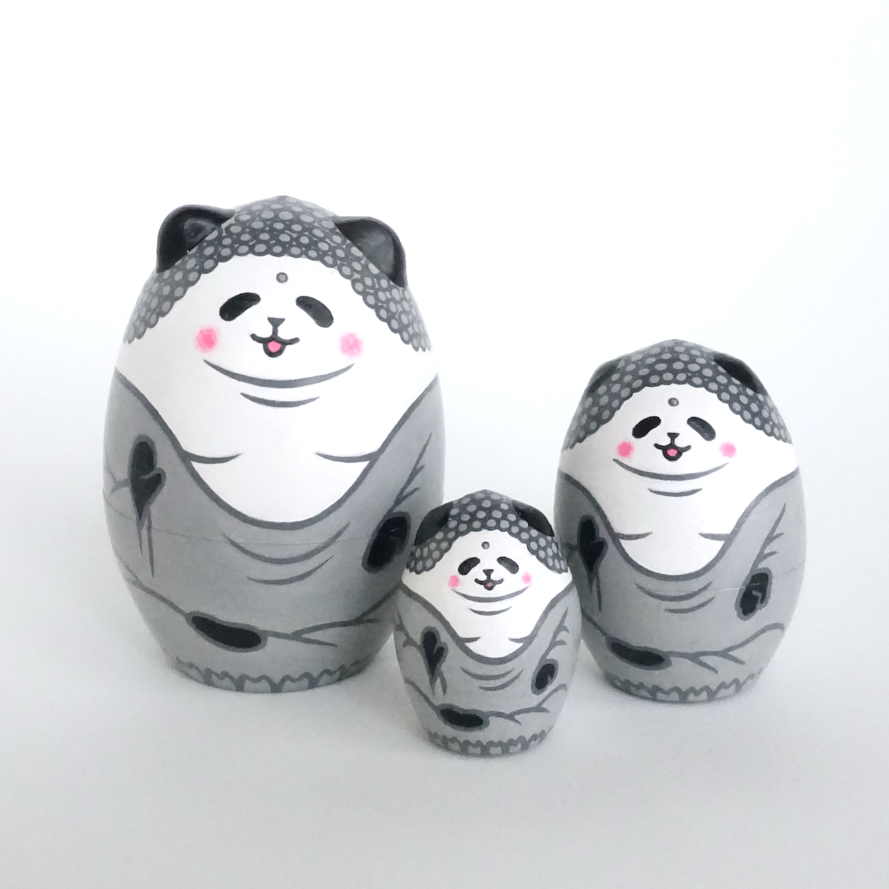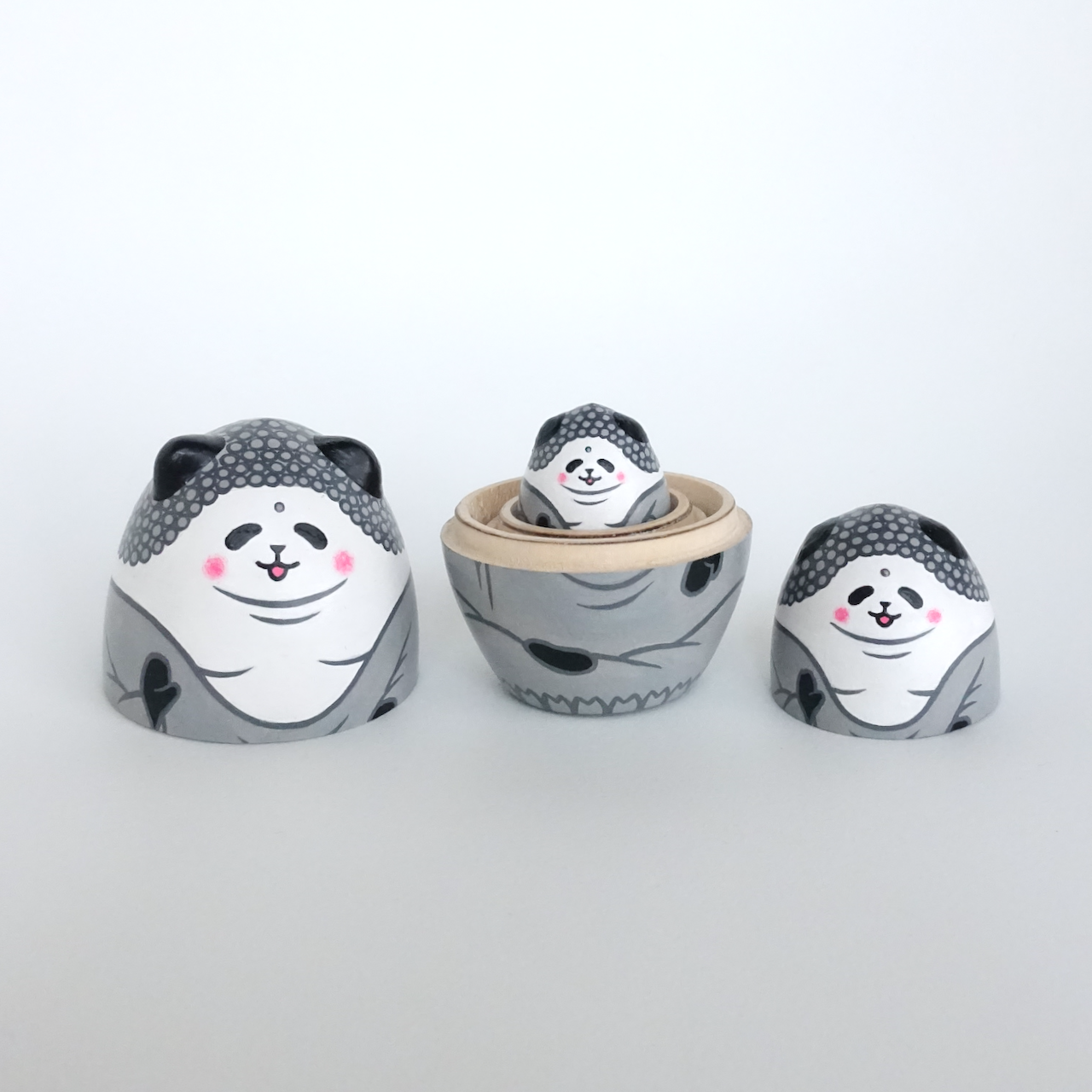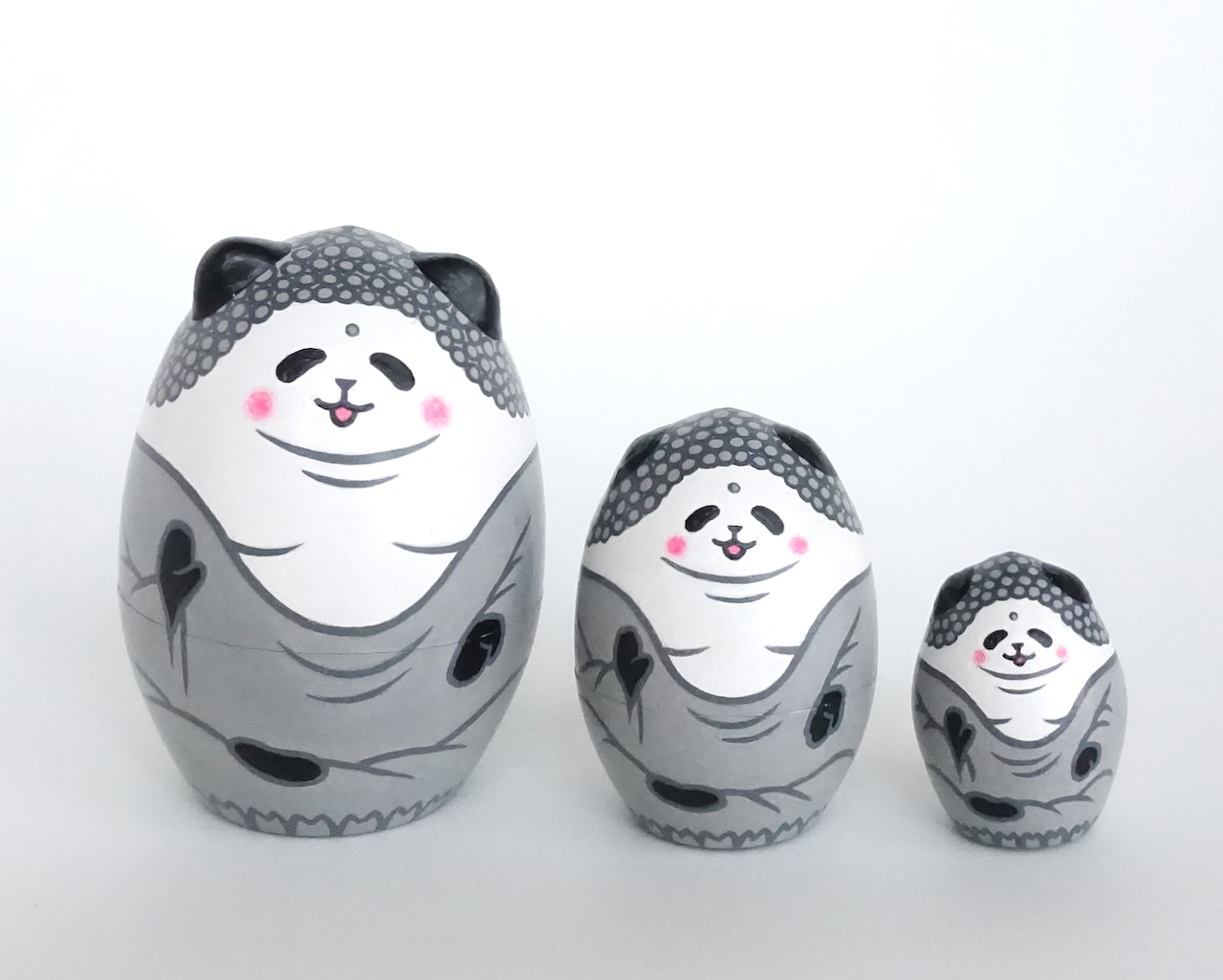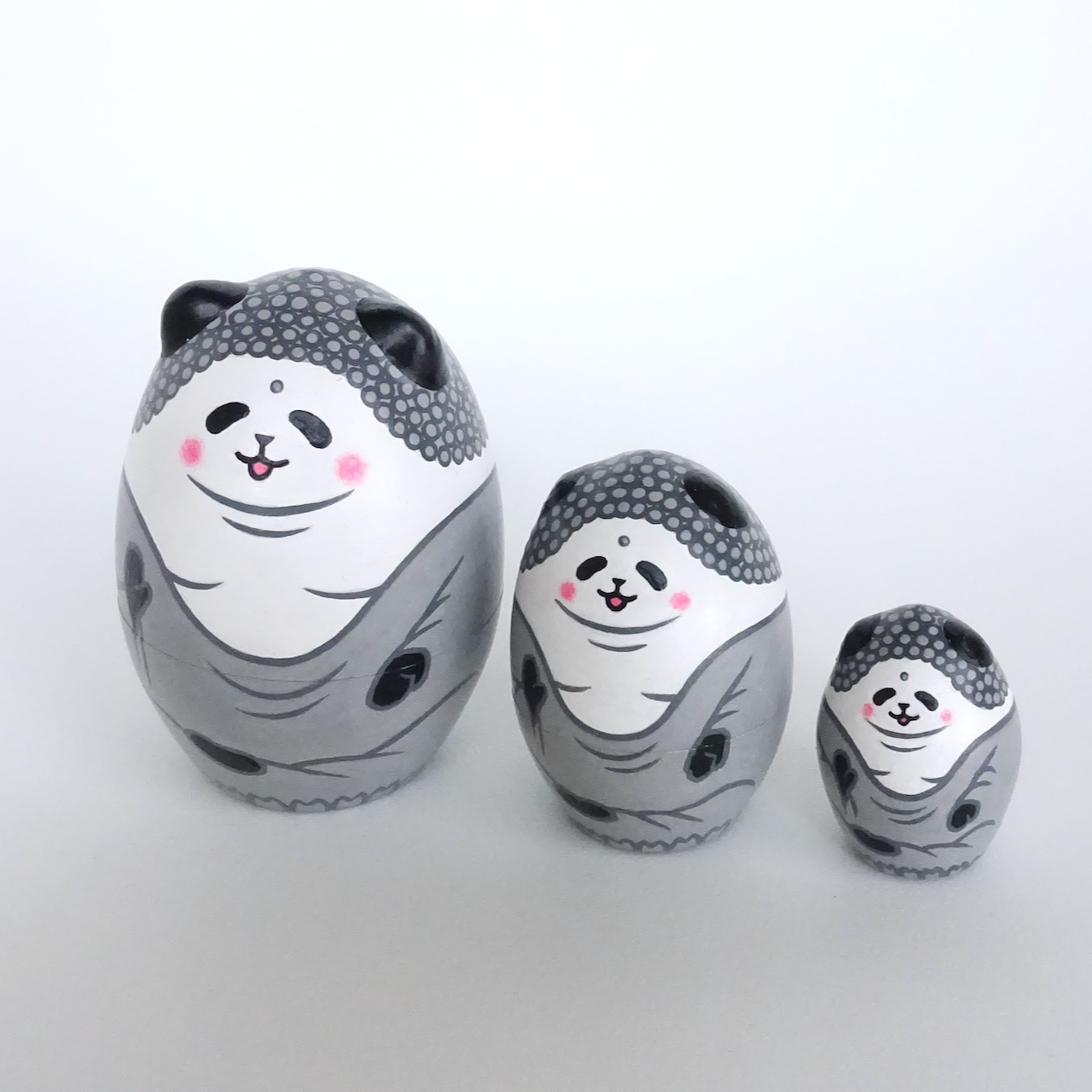 ロシア製のたまご形の木地に、パンダの耳を粘土で造形し、アクリル絵の具で絵付けしました。