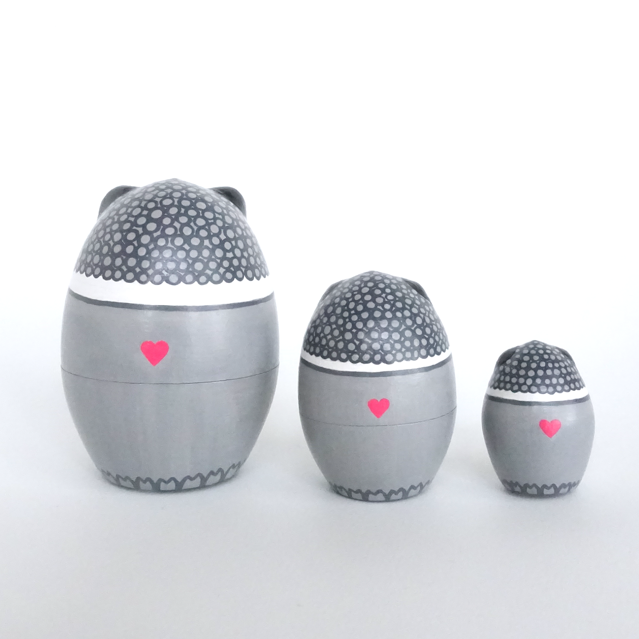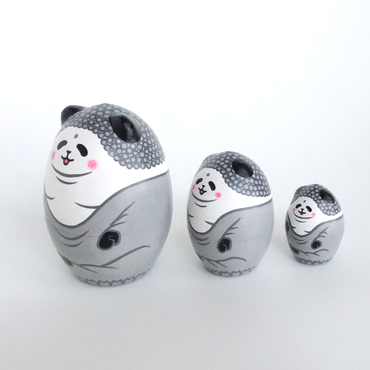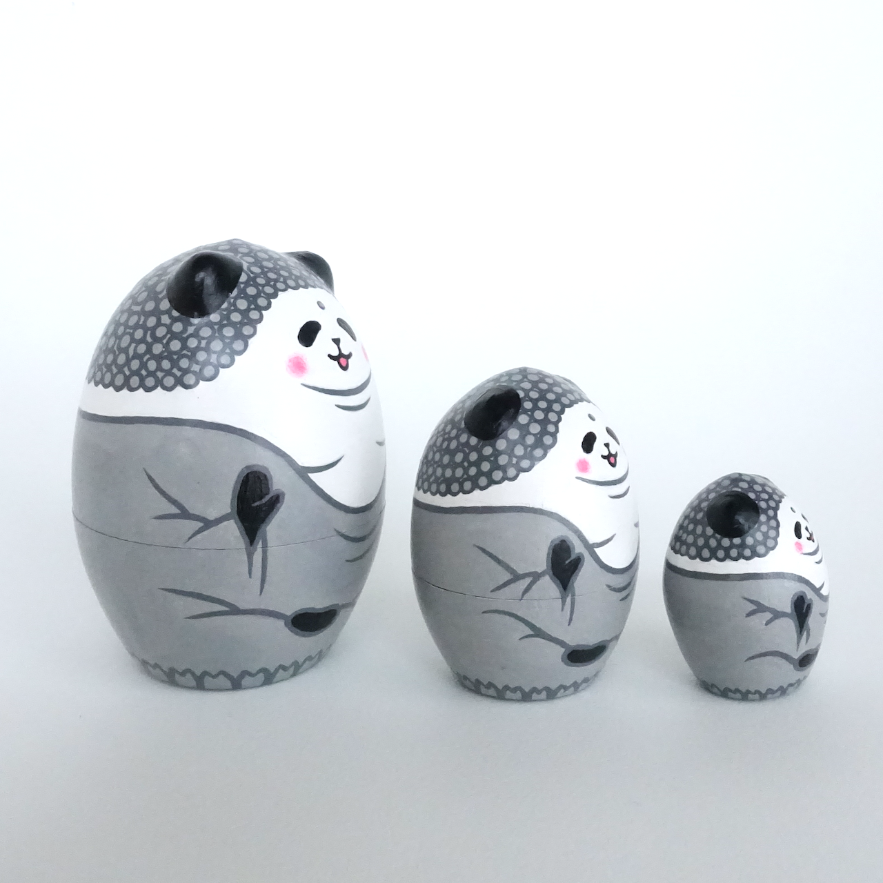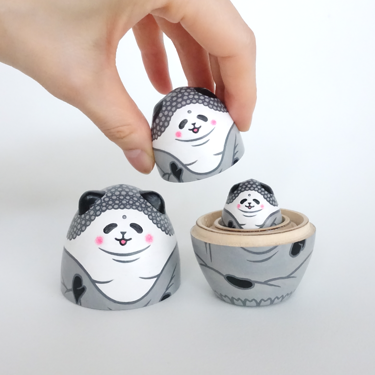 ロシア製のたまご形の木地に、パンダの耳を粘土で造形し、アクリル絵の具で絵付けしました。